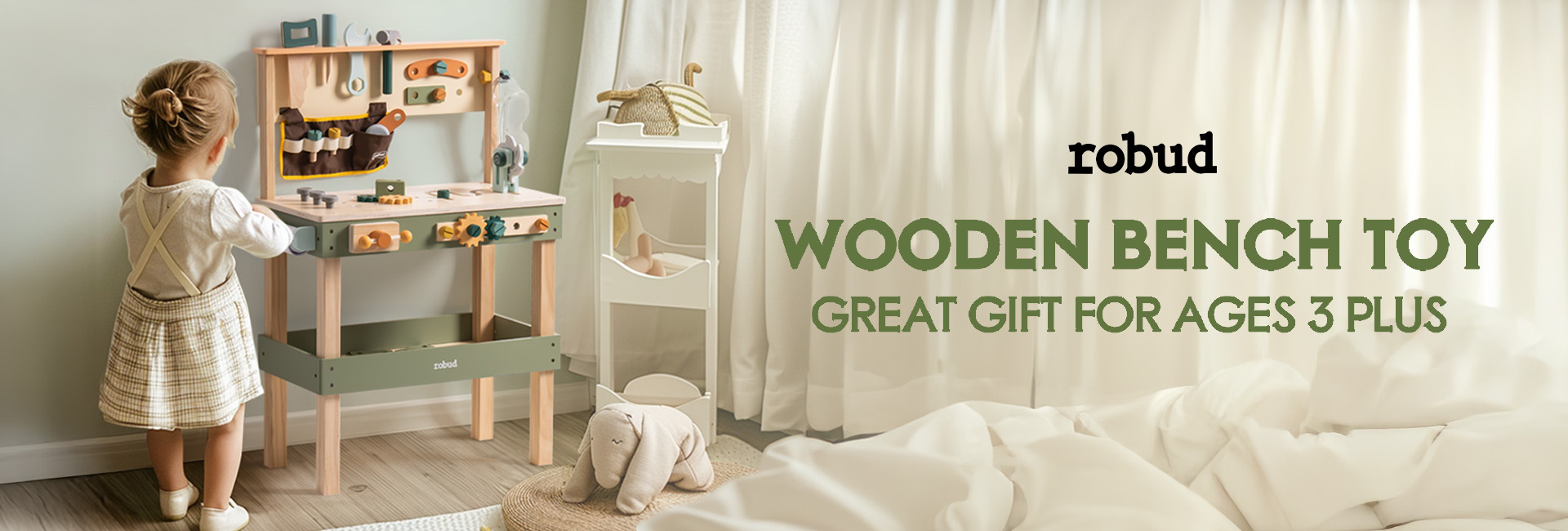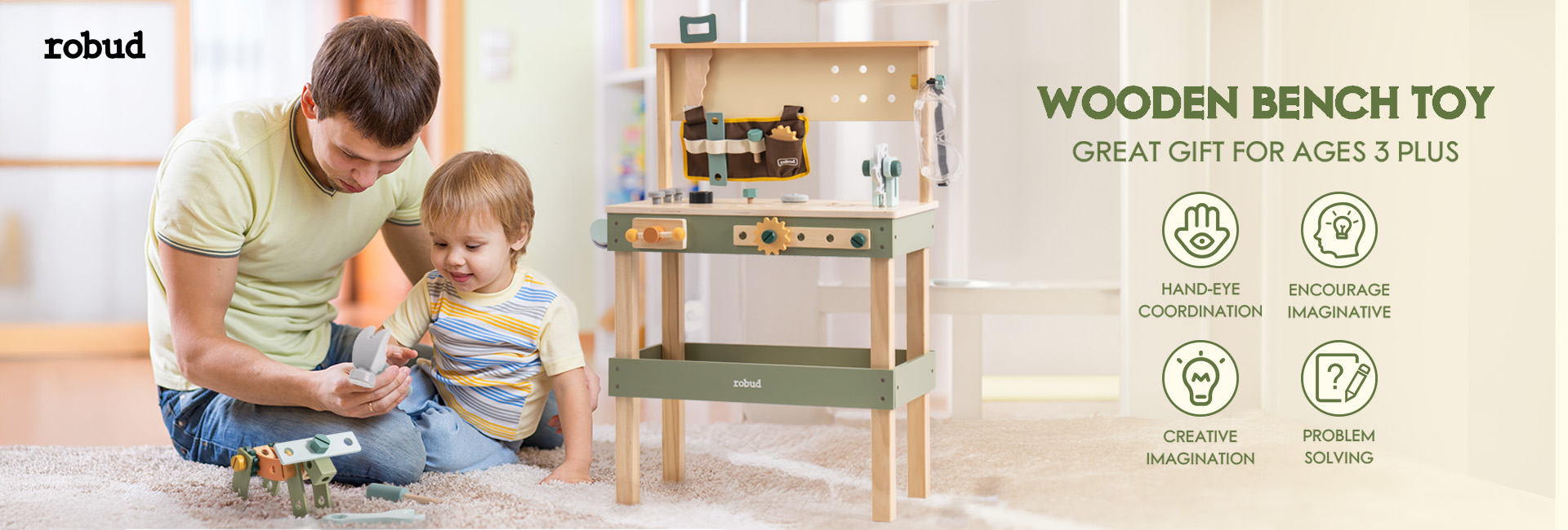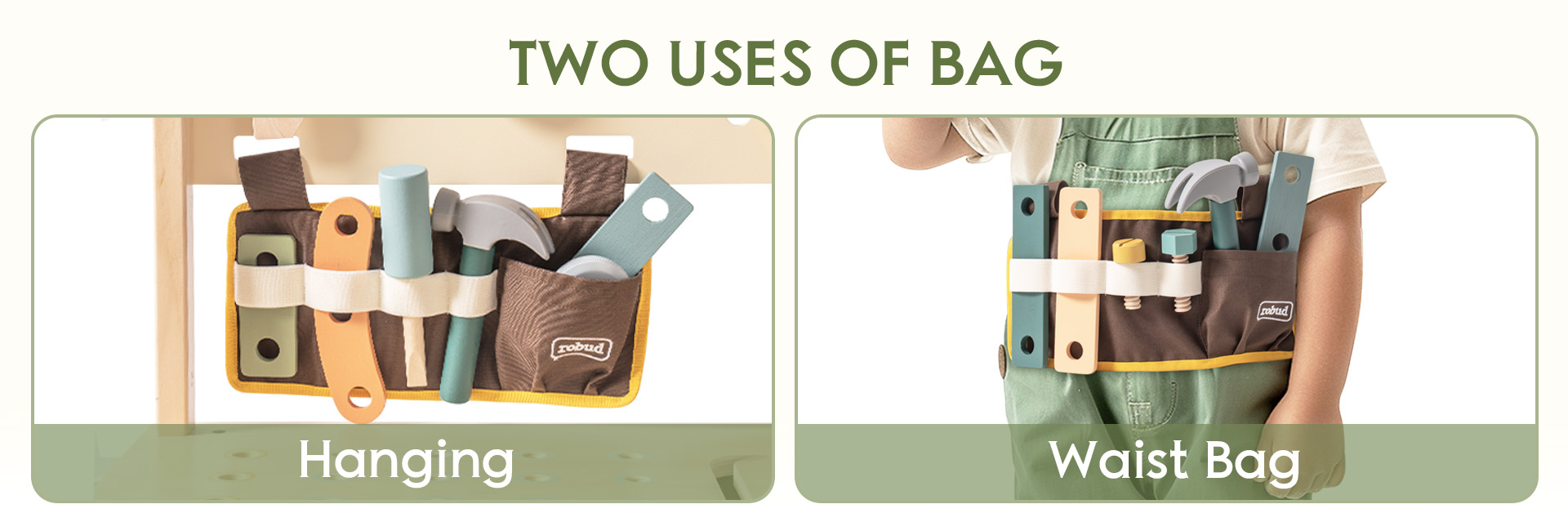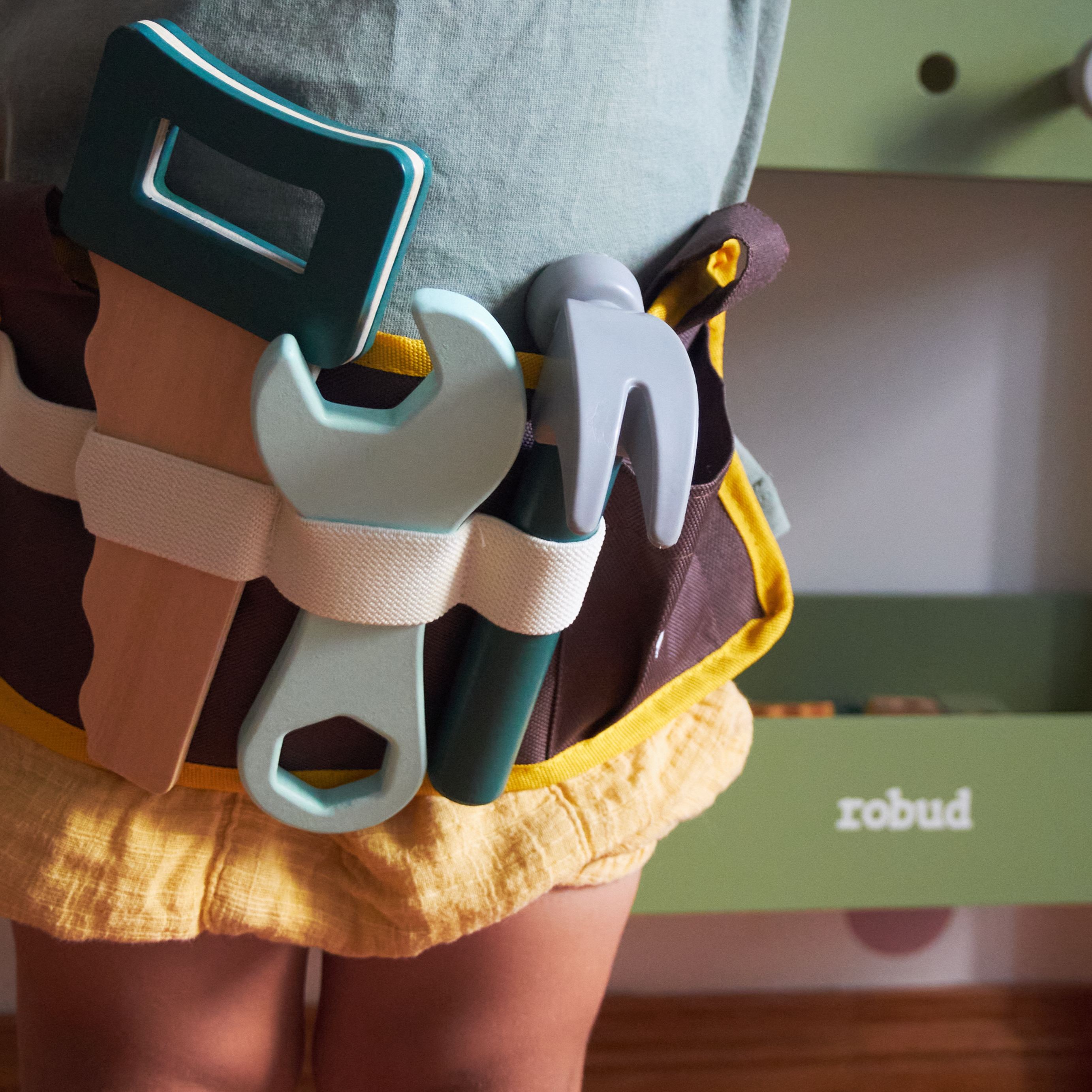 Stazione di gioco versatile: Il set di attrezzi per bambini ROBUD presenta un robusto banco da lavoro in legno, una cintura degli attrezzi con tasca di stoccaggio e occhiali protettivi, incoraggiando i bambini a migliorare le loro abilità pratiche e la loro immaginazione attraverso il gioco di simulazione degli attrezzi.