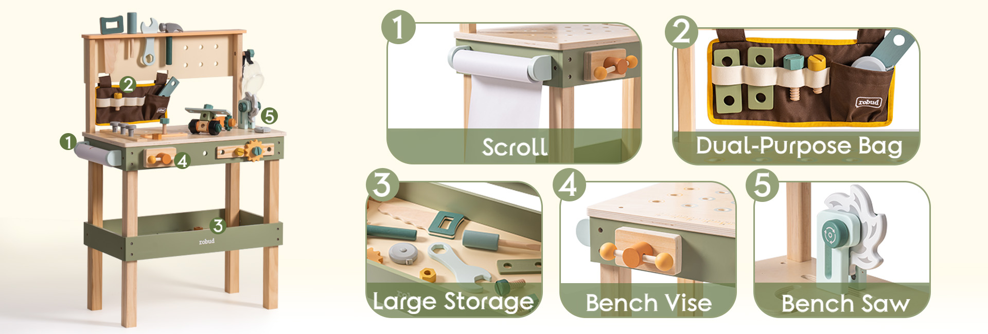 Design intuitivo: Ogni componente del set di attrezzi per bambini ROBUD è progettato con caratteristiche di sicurezza, garantendo bordi lisci per le manine. Le dimensioni pensate di 85cm L x 55cm W x 39cm H sono adattabili a una varietà di posizioni di gioco e stili di gioco dei bambini.