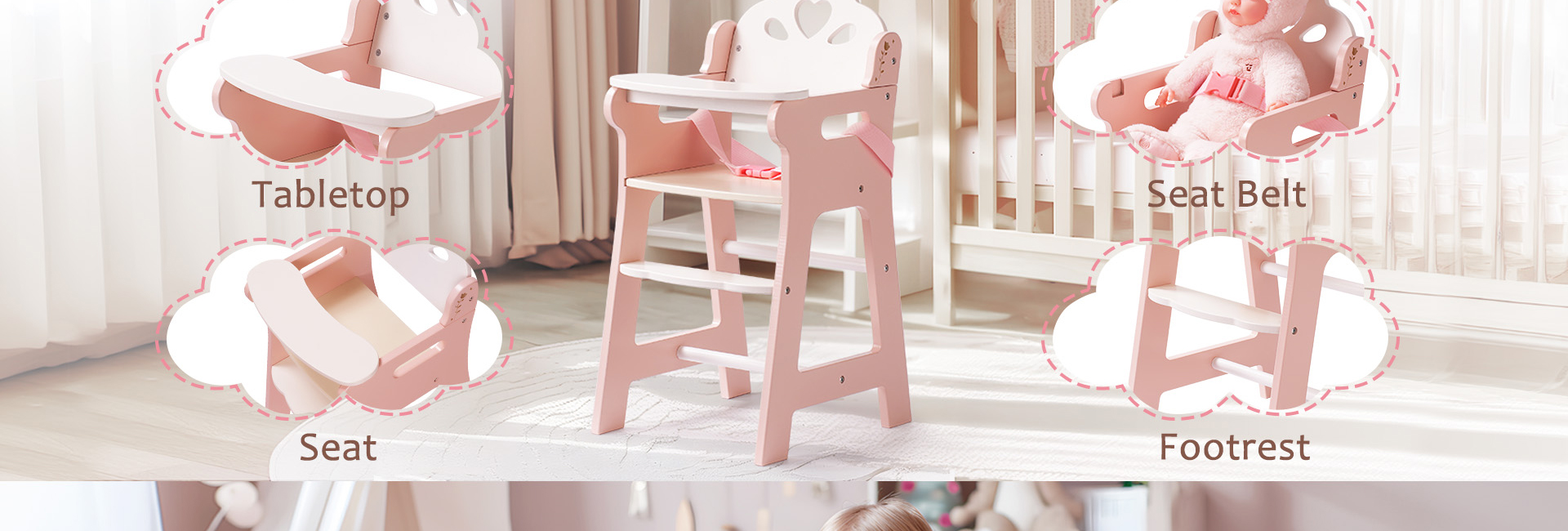 Qualità Premium & Struttura Stabile: La sedia alta per bambole è realizzata in materiale legnoso di alta qualità, ogni parte è lavorata con cura, i bordi sono lisci e privi di schegge, il che non farà male alle mani del tuo bambino. Inoltre, gli angoli arrotondati del design della sedia alta per bambole garantiscono che il tuo bambino eviti collisioni accidentali, offrendo un'esperienza più sicura per l'uso. Più importante, la nostra sedia alta per bambole è più forte, più stabile e ha una vita utile più lunga.