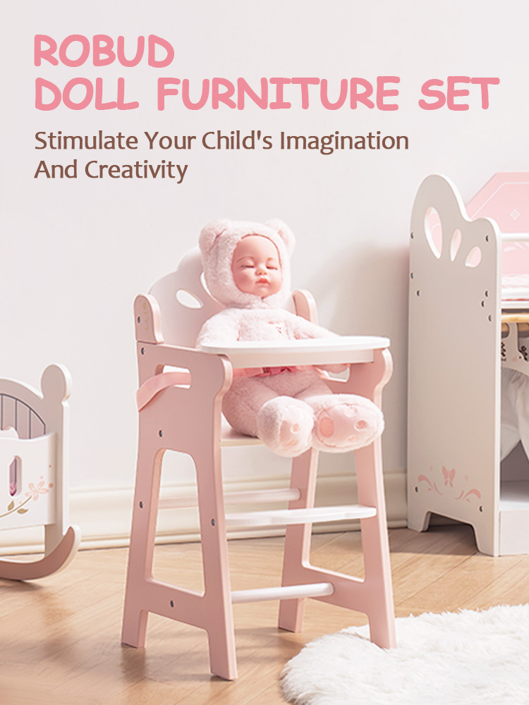 Gioco di Ruolo: Questa sedia alta per bambole consente ai bambini di creare scenari e storie che stimolano la loro immaginazione e creatività mimando comportamenti di alimentazione e cura della vita reale. È ottima per lo sviluppo dei bambini.