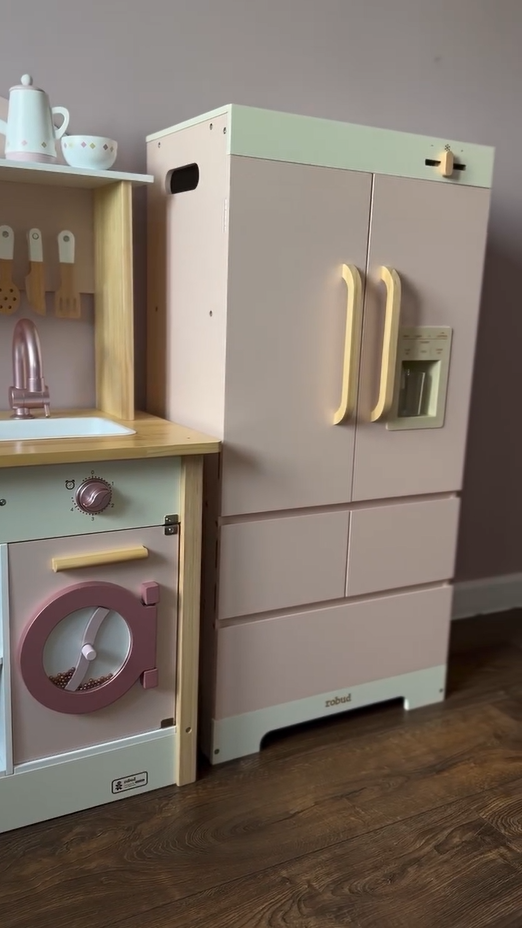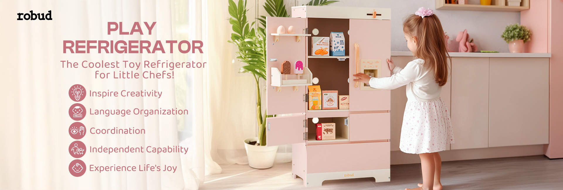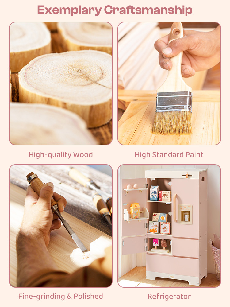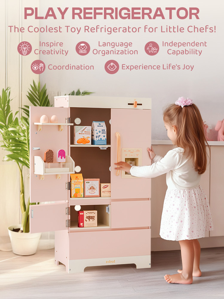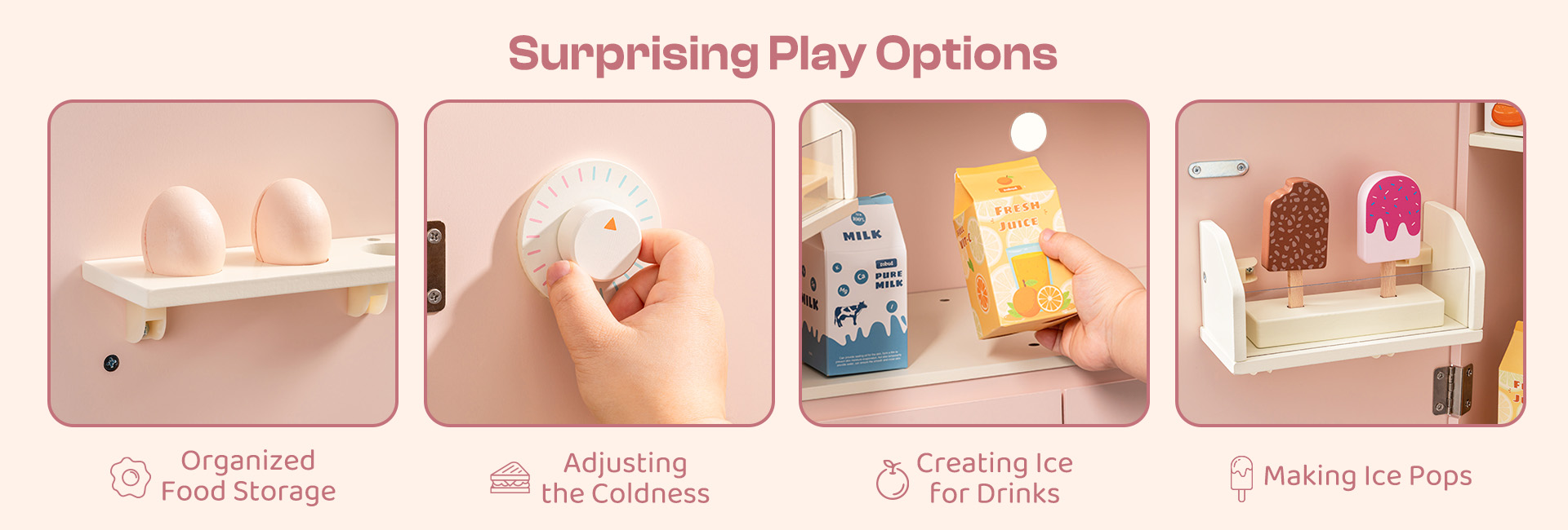 Manopola della Temperatura Regolabile: Il frigorifero include una divertente manopola della temperatura regolabile che consente ai bambini di fingere di controllare la temperatura del frigorifero, migliorando la loro esperienza di gioco di ruolo e la comprensione degli elettrodomestici del mondo reale.