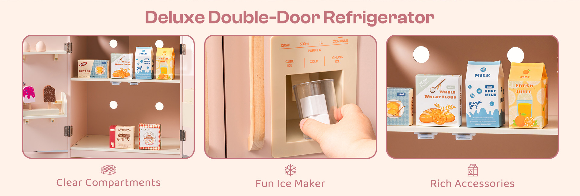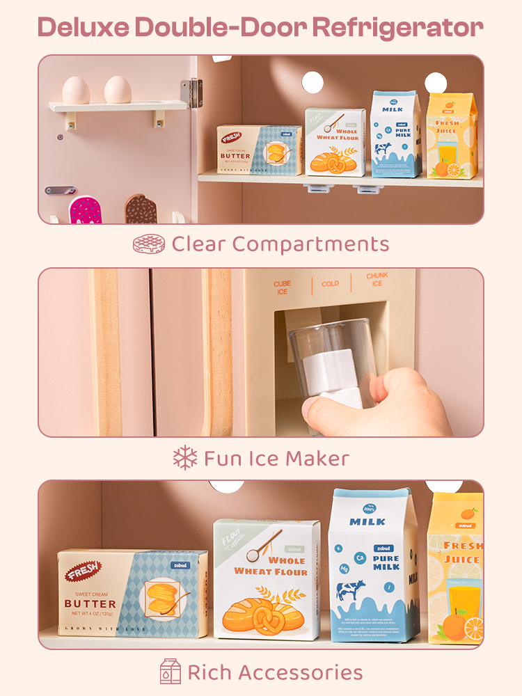 Funzione Fabbrica di Ghiaccio: Questo frigorifero giocattolo è dotato di una fabbrica di ghiaccio integrata, dando ai bambini l'opportunità di interagire con una caratteristica fresca e realistica, mimando la funzionalità di un vero frigorifero.
