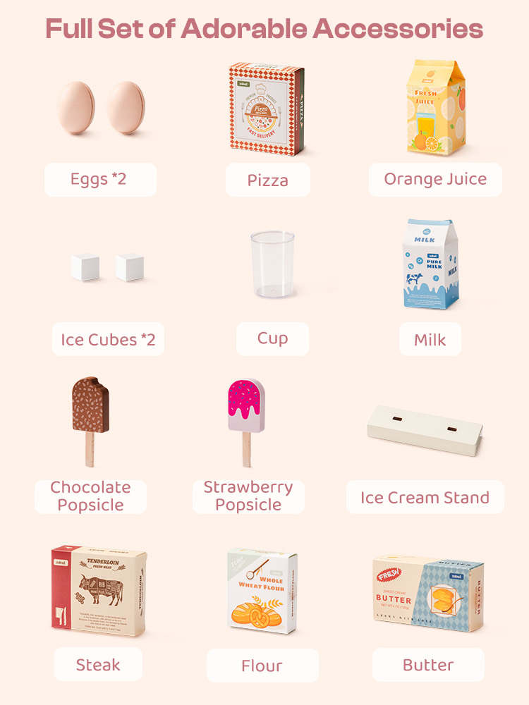 Esperienza di Gioco Realistica: Questo frigorifero da cucina in legno viene fornito con alimenti realistici, tra cui gelato, uova e altre prelibatezze. L'uovo "da tagliare" incluso offre un'esperienza interattiva, permettendo ai bambini di tagliare l'uovo a metà per un divertimento aggiuntivo.