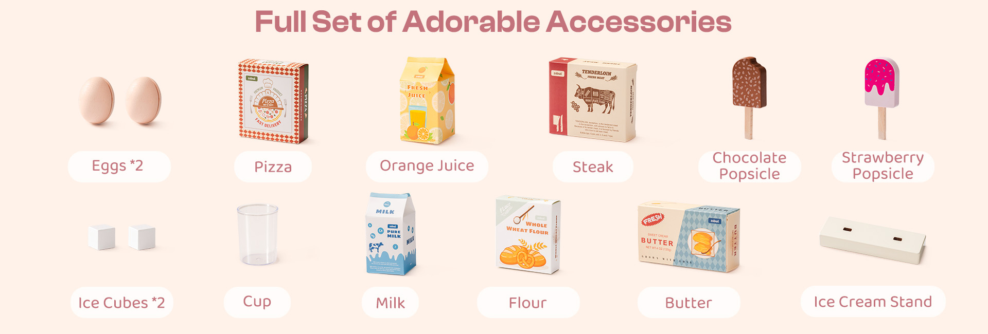 Incoraggia il Gioco Creativo: L'aggiunta di divertenti e colorati alimenti come gelato e una varietà di frutta e verdura promuove la creatività e il gioco di ruolo, aiutando i bambini a sviluppare abilità sociali e di problem-solving mentre si dedicano alla cucina immaginaria.
