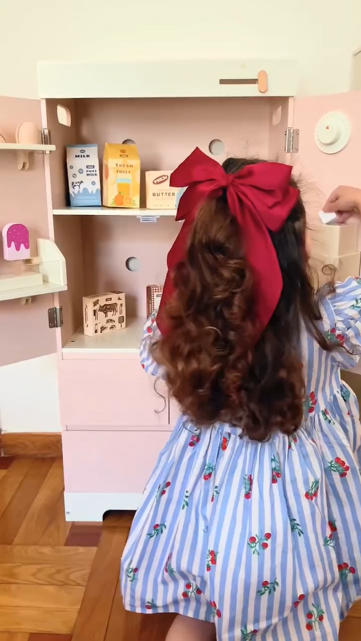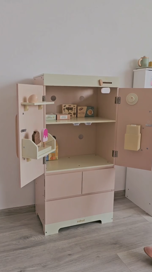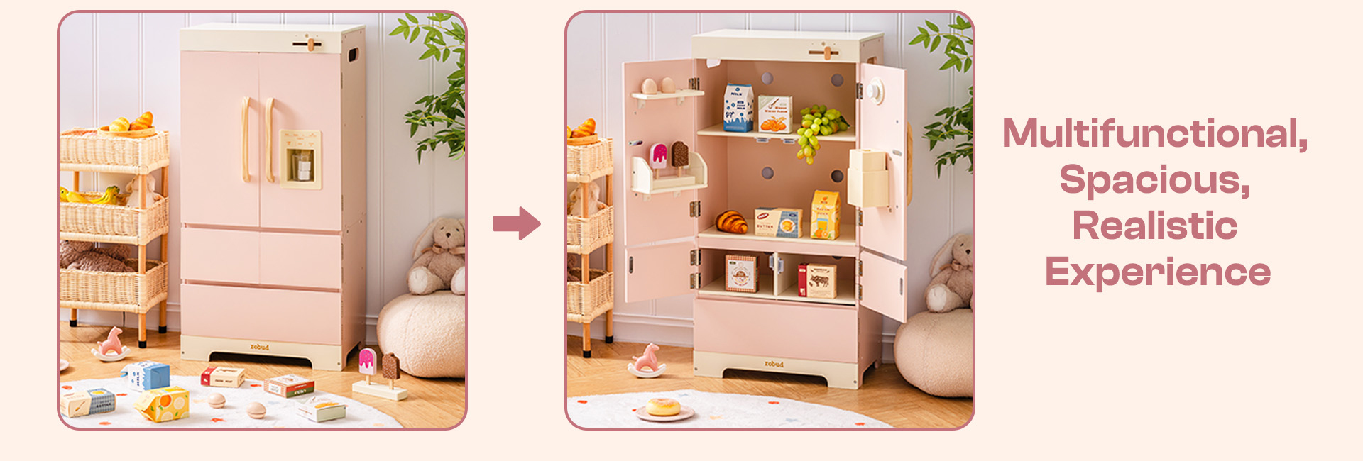 Spazio di Stoccaggio Ampio: Con ampio spazio all'interno, questo frigorifero non solo conserva i giocattoli alimentari inclusi, ma offre anche molto spazio per organizzare e riporre ulteriori alimenti e accessori da gioco.