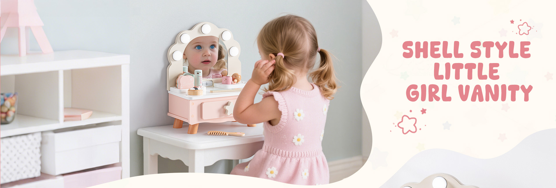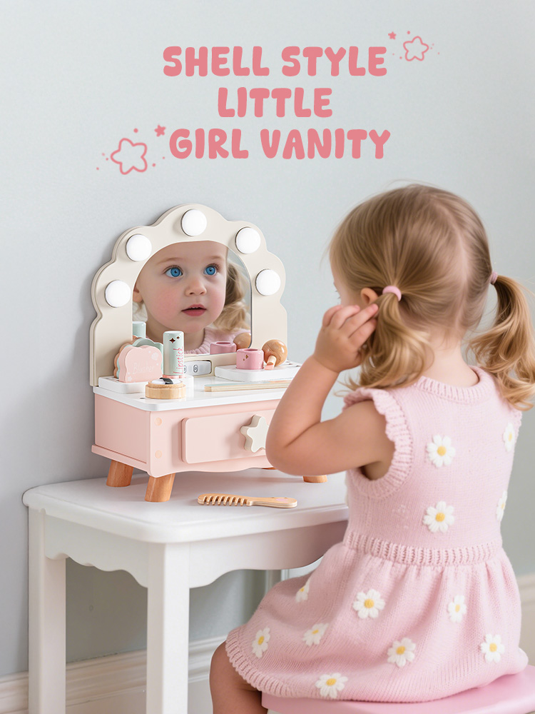 【Set da toeletta a conchiglia】Facile da montare, questo set da toeletta a conchiglia è dotato di un piccolo cassetto rimovibile e di uno specchio per creare una versione mini realistica di una toeletta a grandezza naturale. I bambini possono divertirsi a giocarci.