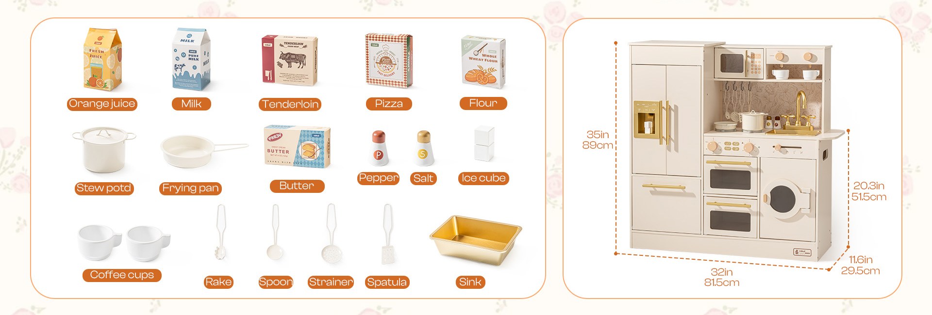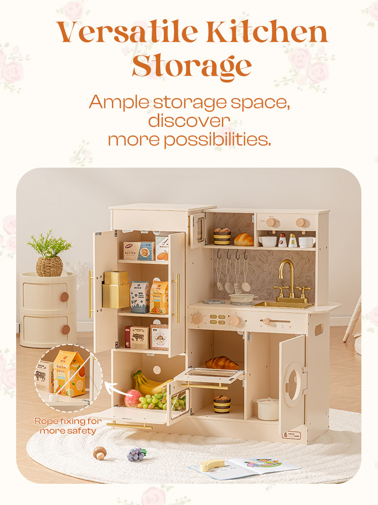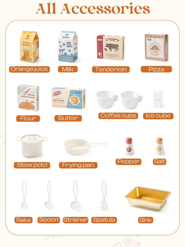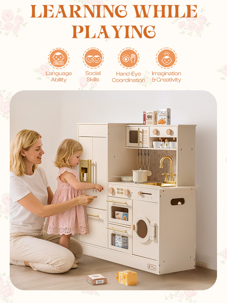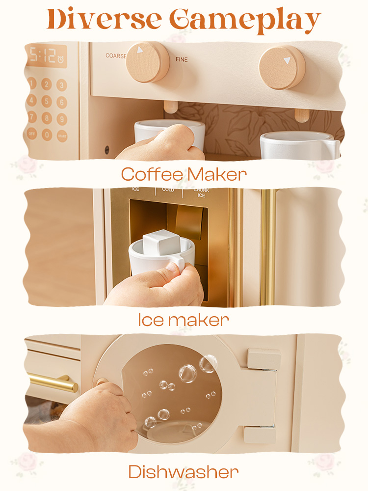 Aspetto elegante e attenzione ai dettagli: Questo set elegante presenta un corpo giallo chiaro con decorazioni dorate, che si adatta perfettamente a qualsiasi stanza. Dettagli come macchine da caffè, tende, frigoriferi e armadietti aumentano il senso di lusso e creano una cucina giocattolo unica per i tuoi bambini.