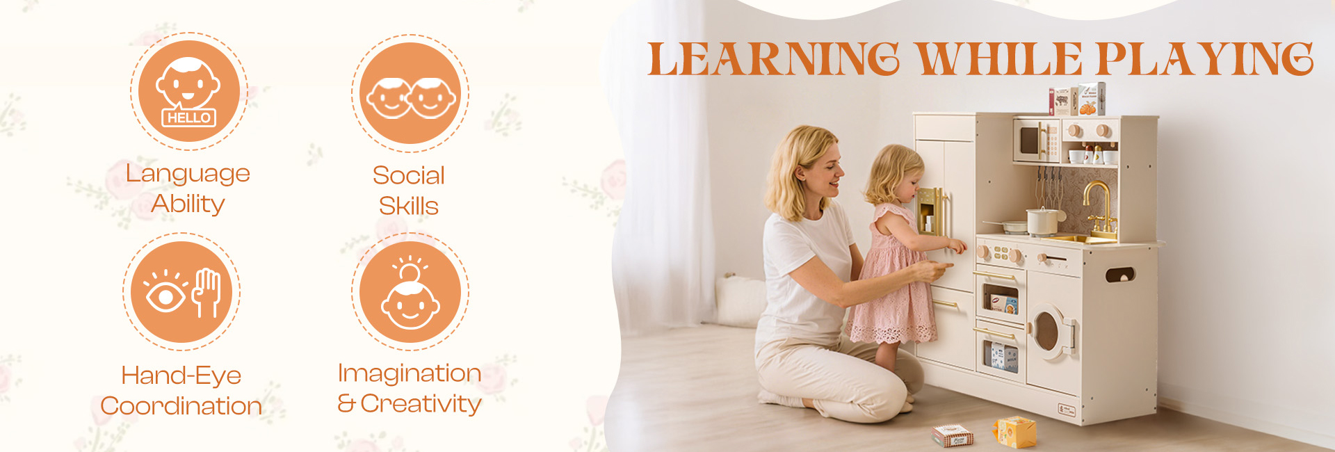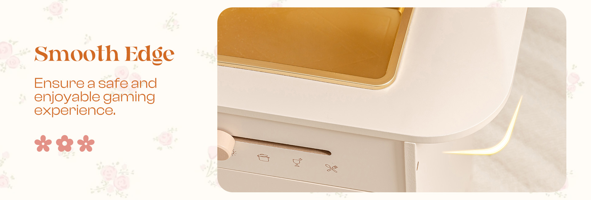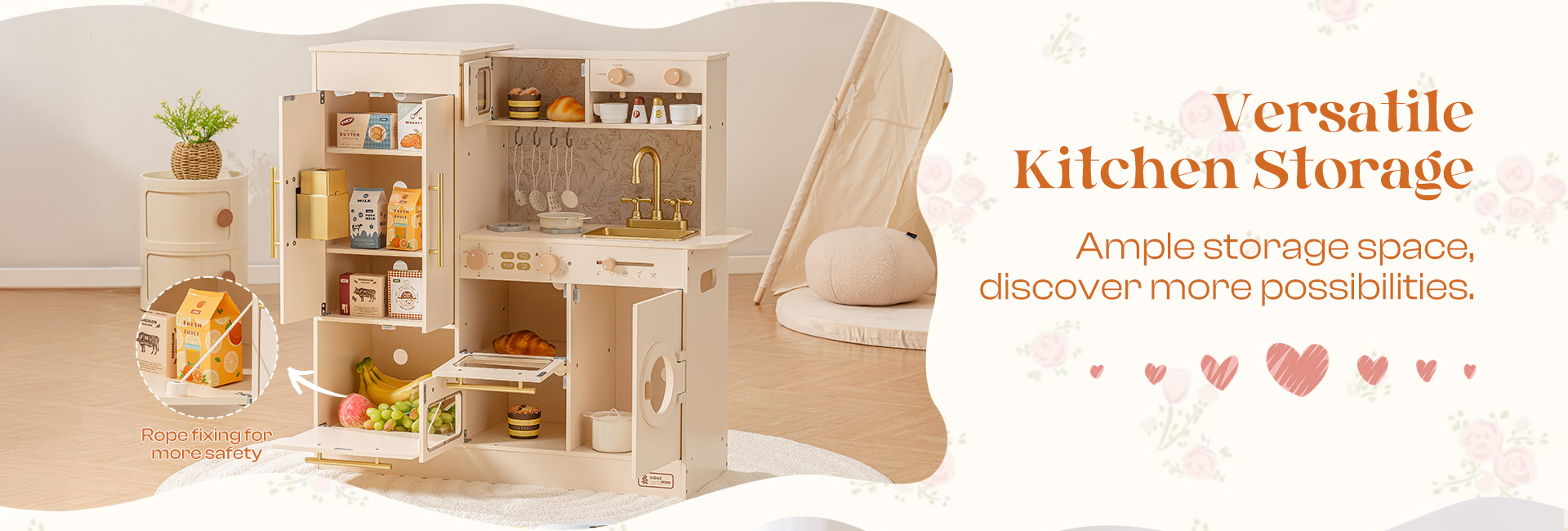 Aspetto elegante e attenzione ai dettagli: Questo set elegante presenta un corpo giallo chiaro con decorazioni dorate, che si adatta perfettamente a qualsiasi stanza. Dettagli come macchine da caffè, tende, frigoriferi e armadietti aumentano il senso di lusso e creano una cucina giocattolo unica per i tuoi bambini.