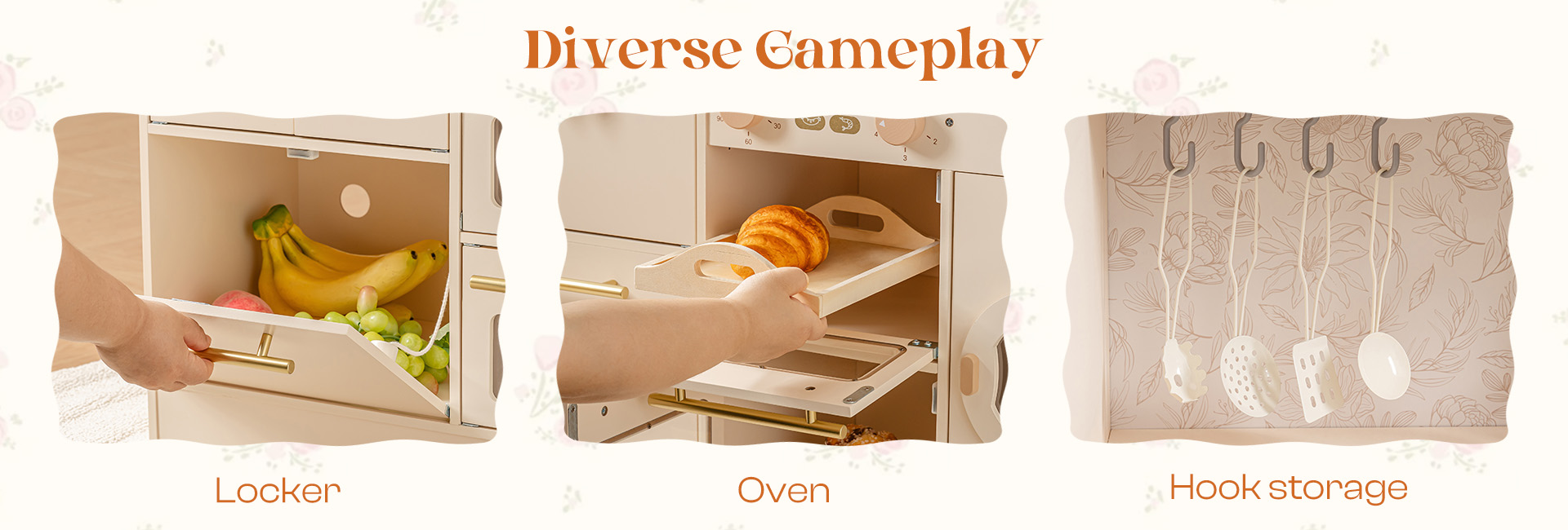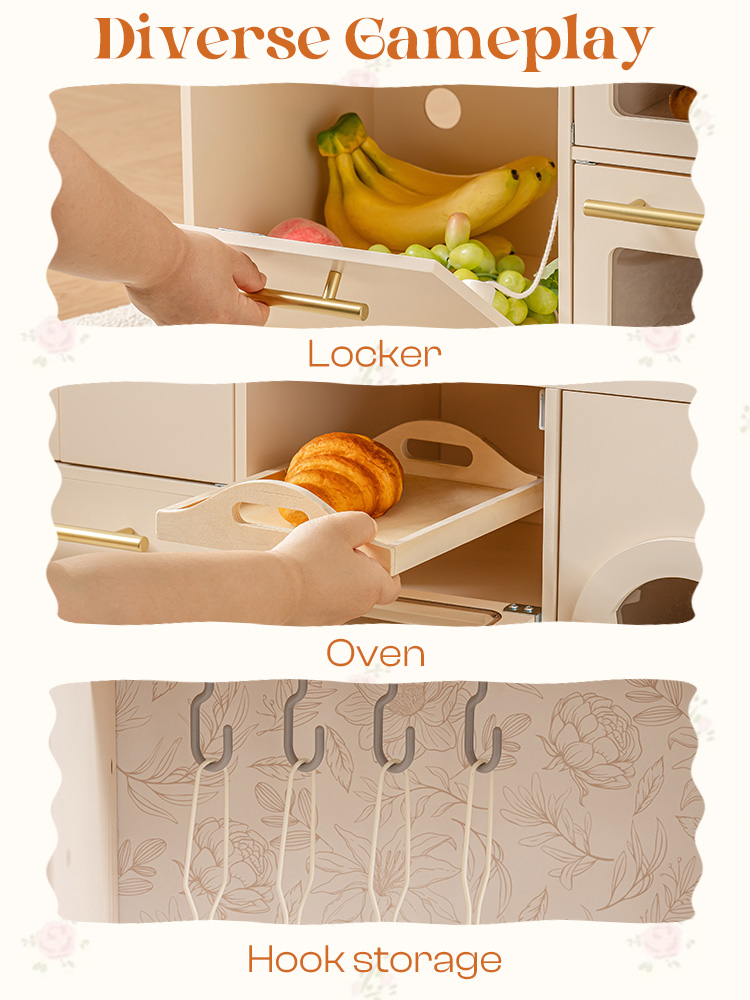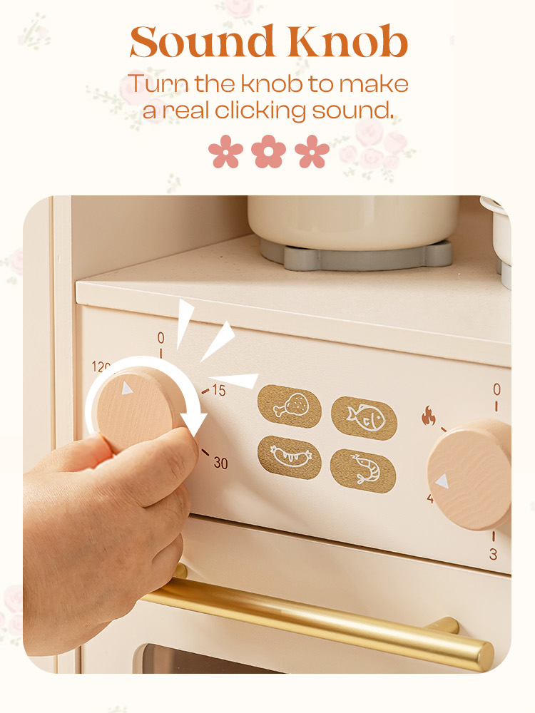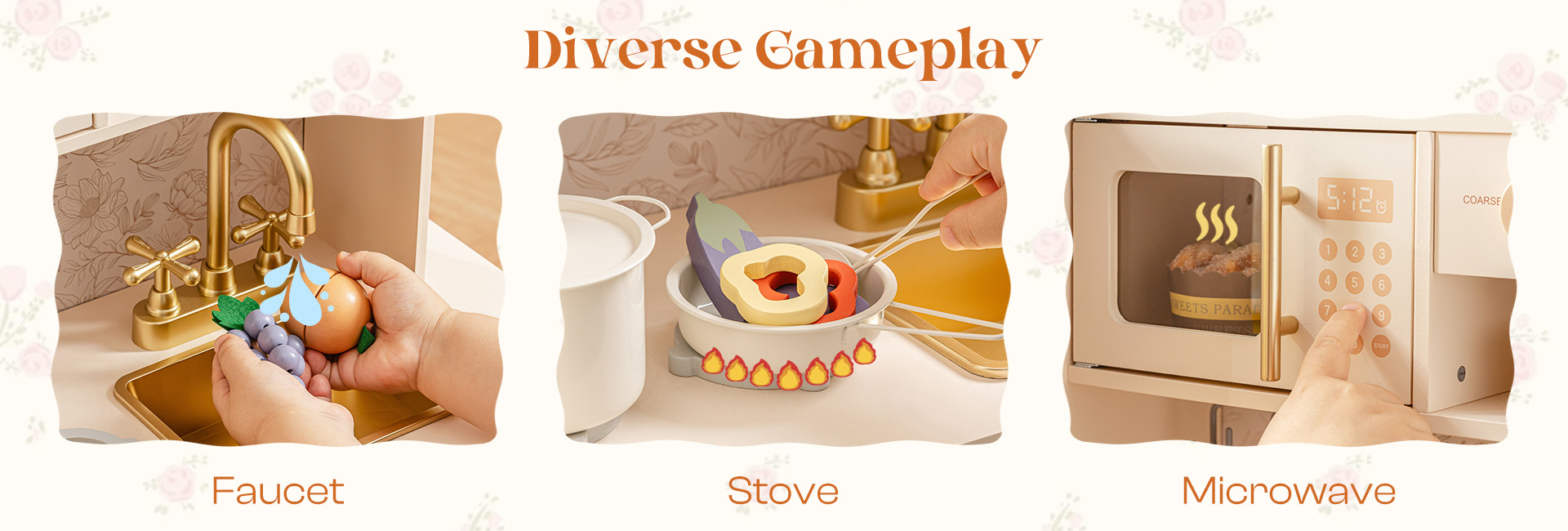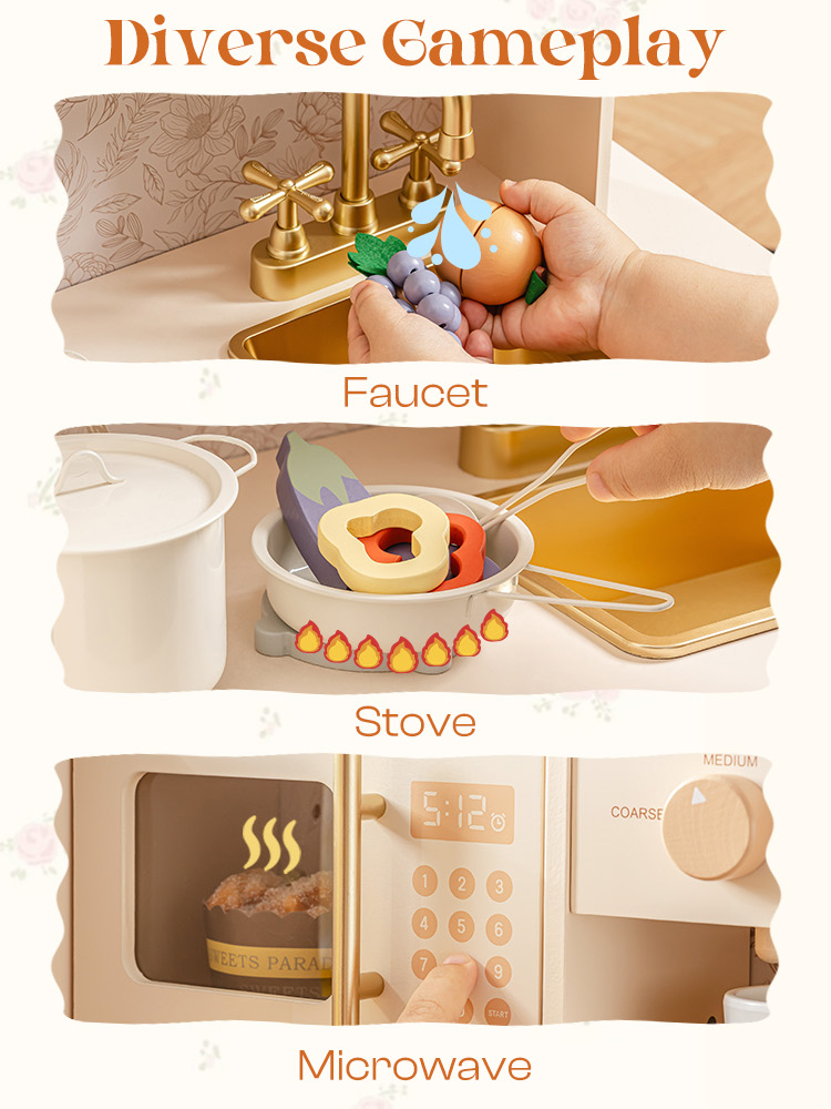 Funzioni ricche e modi di giocare diversi: Il set contiene elementi interattivi come manopole rotanti, porte del forno apribili e rubinetti rotanti, che simulano le operazioni reali in cucina, permettendo ai bambini di rendere il tempo di gioco più interessante e divertente mentre apprendono preziose abilità di vita.