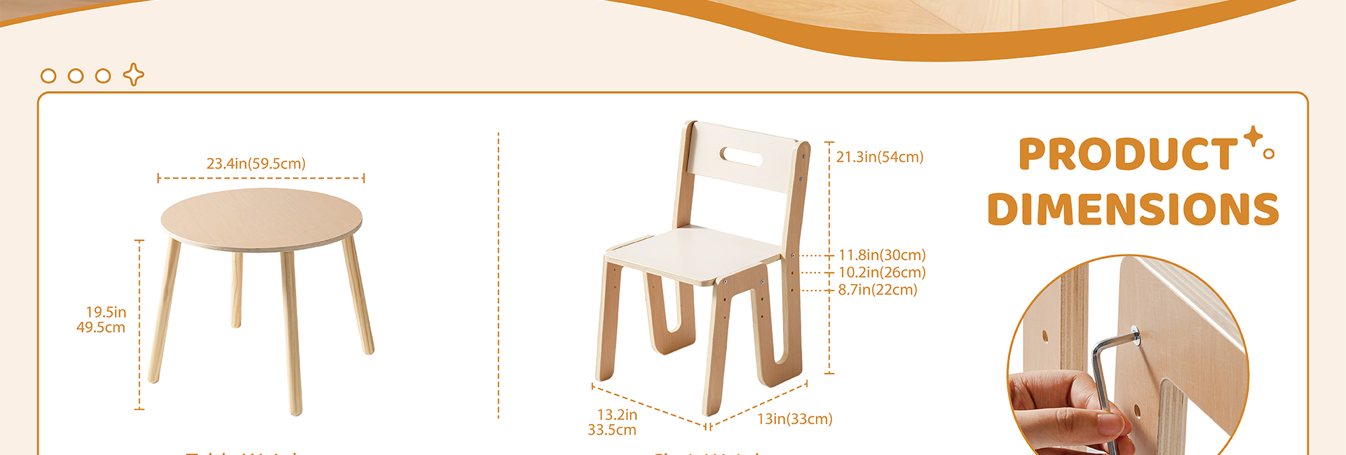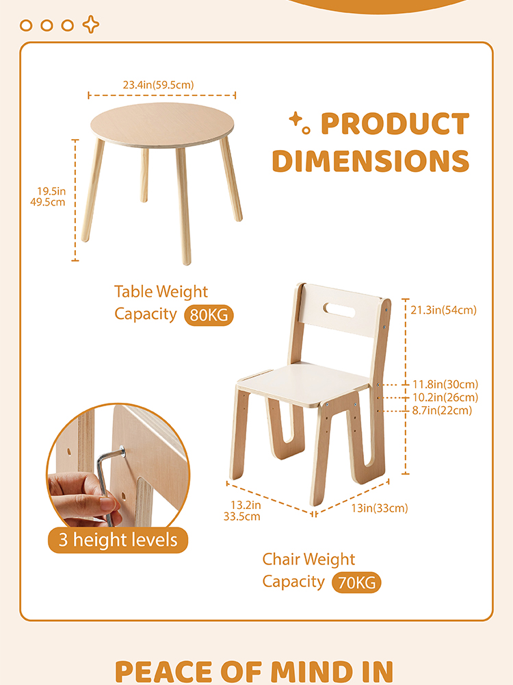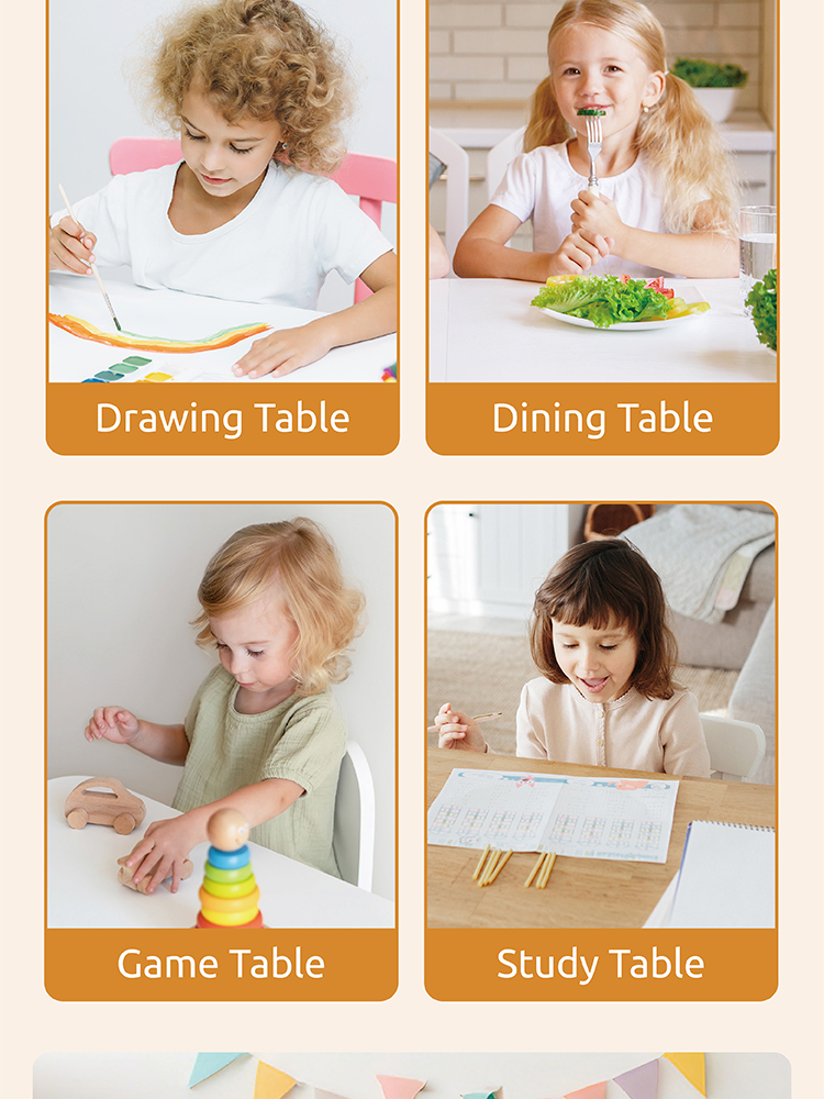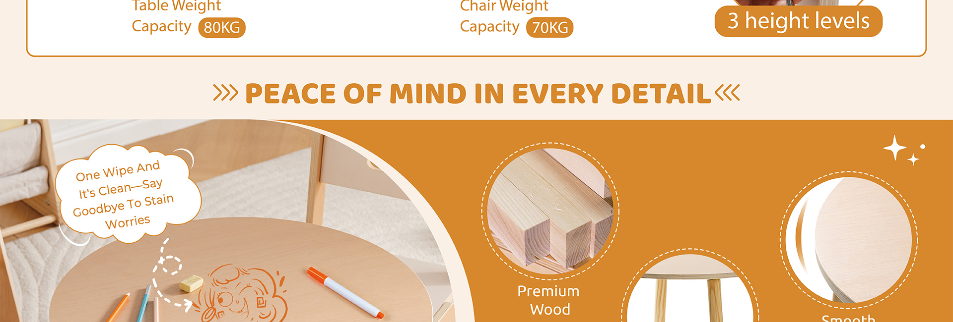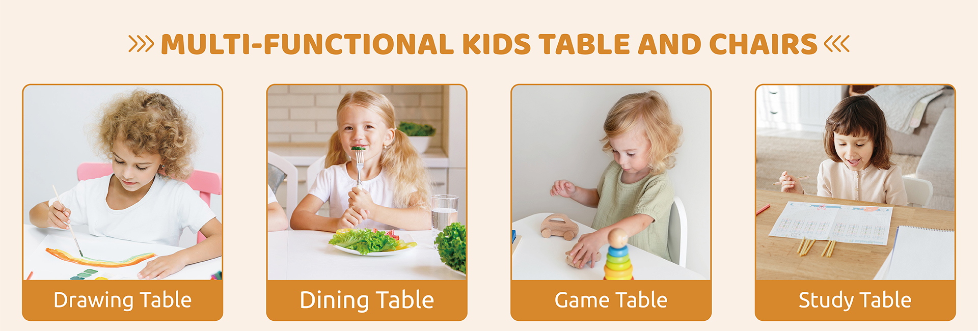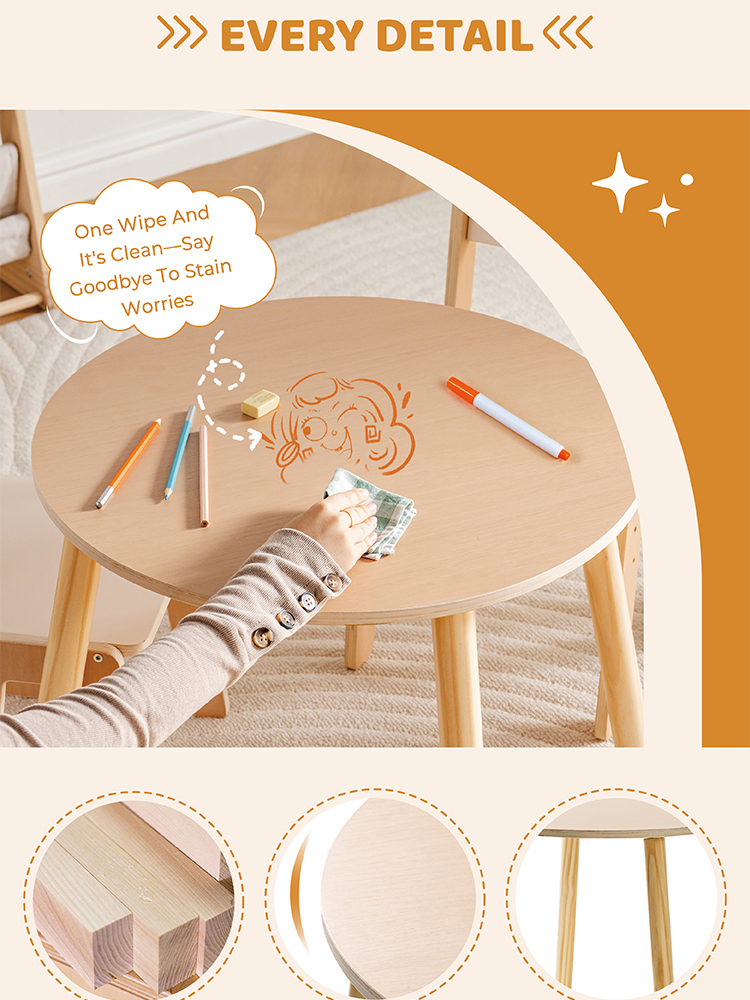 Pulizia e Stoccaggio Convenienti: La superficie verniciata e impermeabile non è solo innocua per la salute dei bambini, ma è anche facile da pulire con un panno umido. Con un design salvaspazio, puoi spingere completamente le sedie sotto il tavolo o impilare le sedie sul piano del tavolo, il che è più conveniente per lo stoccaggio o per spazzare il pavimento.