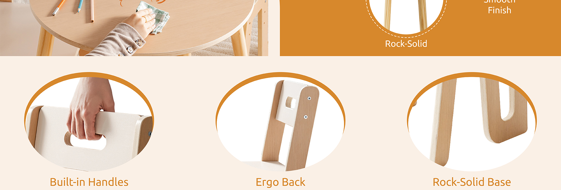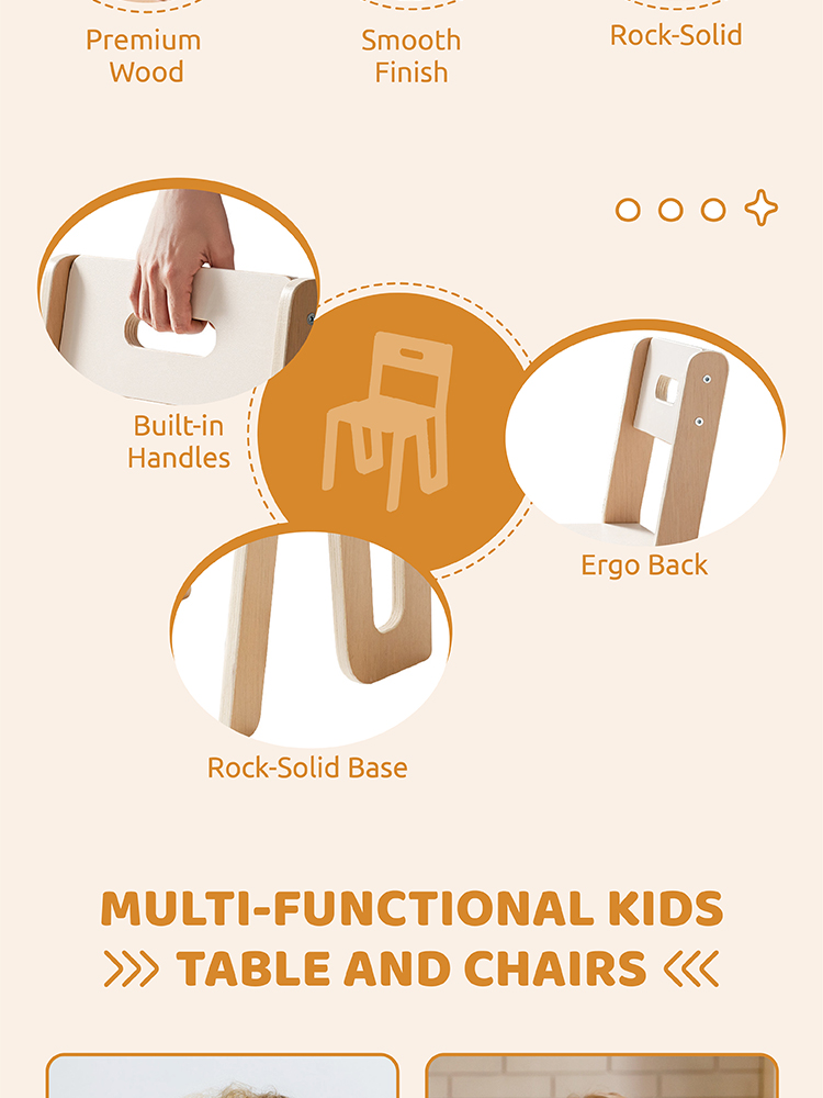 Design Ergonomico e Adatto ai Bambini: Considerando la sicurezza, questo set di tavolo e sedie per attività infantili è costruito con bordi arrotondati che prevengono graffi e lividi. Inoltre, lo schienale della sedia è dotato di una curva ergonomica, che protegge la colonna vertebrale e aiuta i bambini a sviluppare una postura seduta sana.