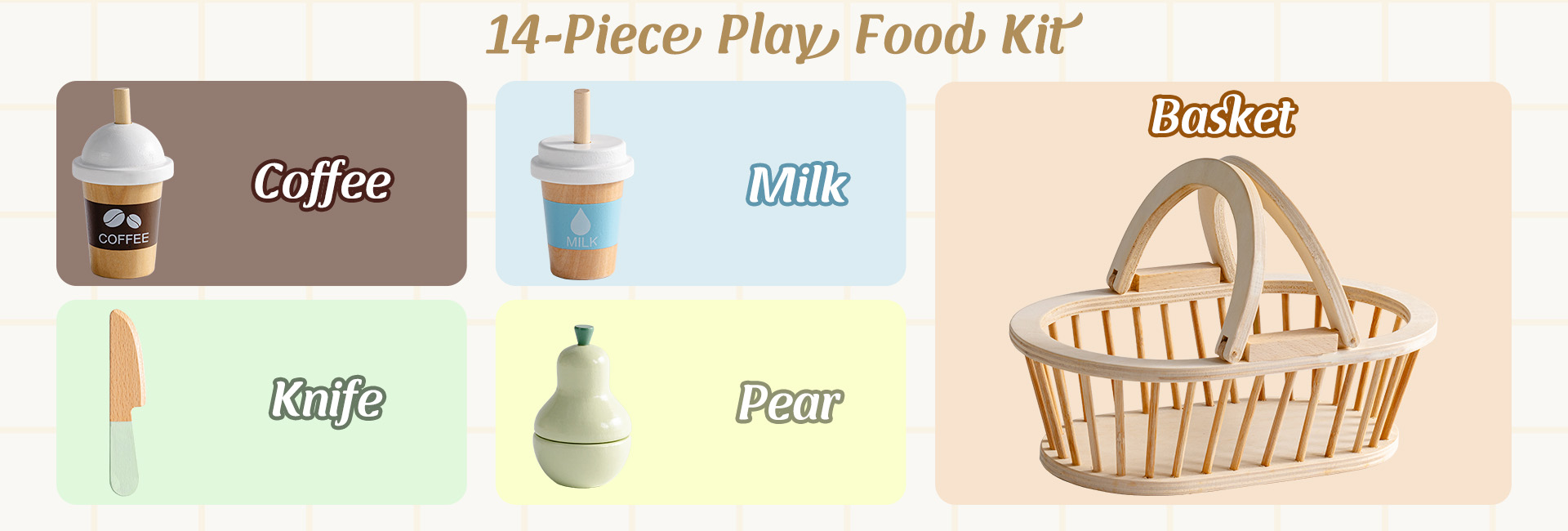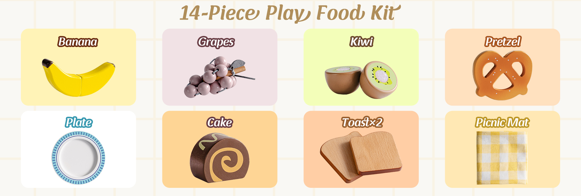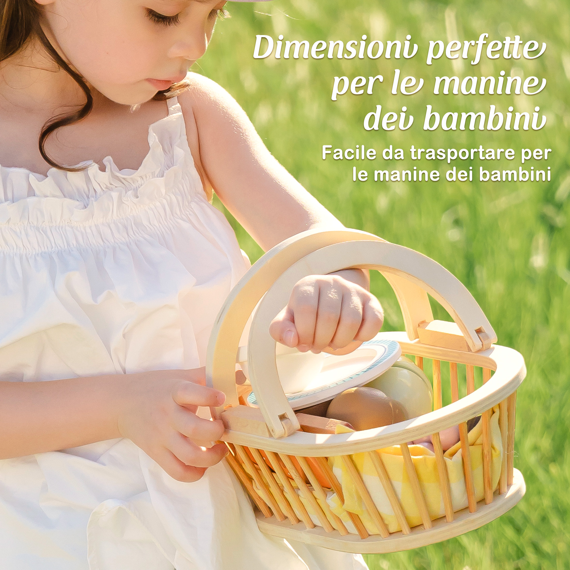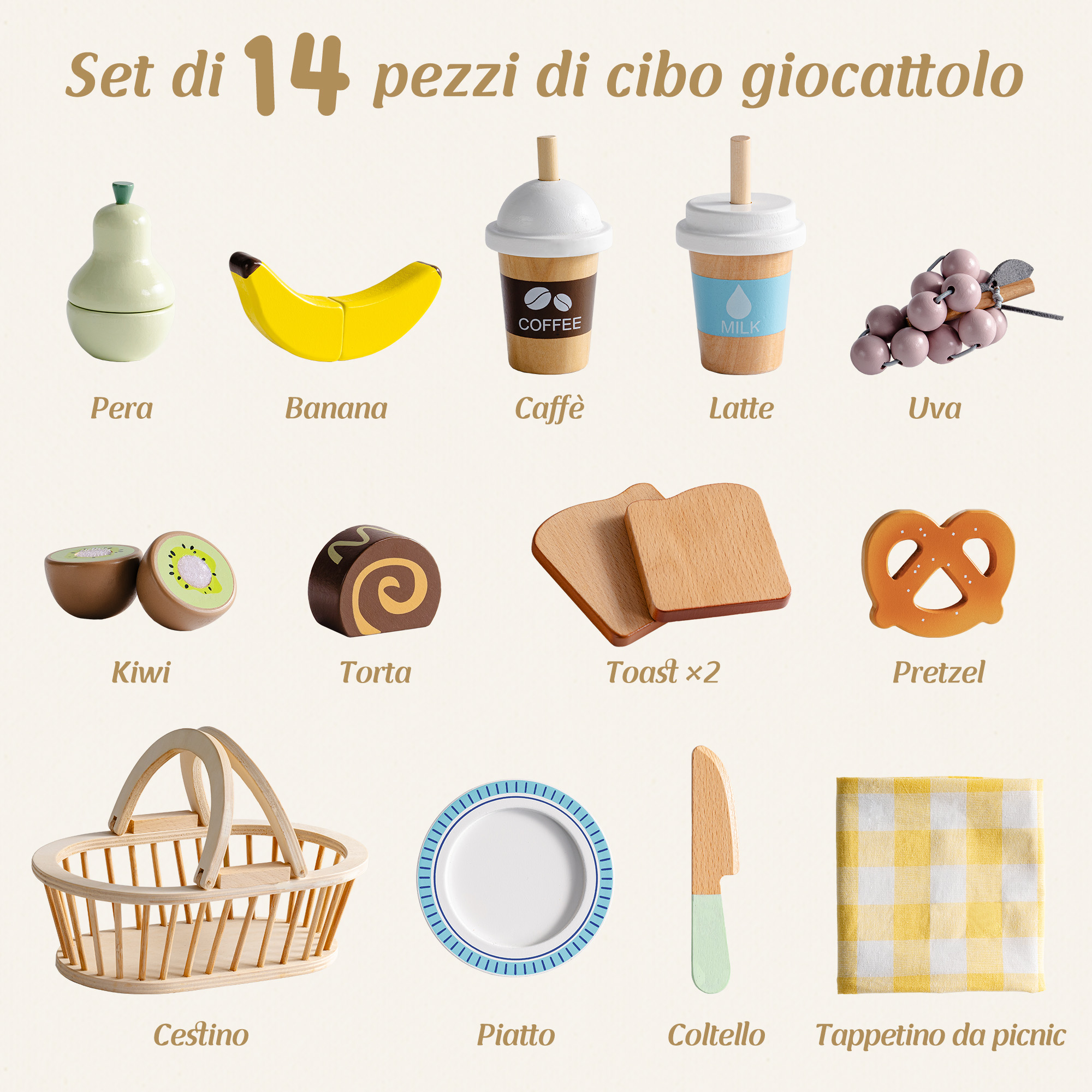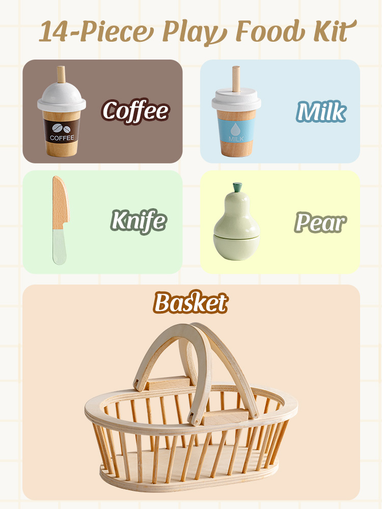- Set da picnic tutto in uno: Include tutto ciò di cui i bambini hanno bisogno per un divertente picnic di fantasia—cestino, pera, uva, kiwi, fetta di pane, banana, rotolo di torta, caffè, latte, piatto, coltello e tovaglia da picnic. Set perfetto per iniziare il gioco di ruolo immaginativo.