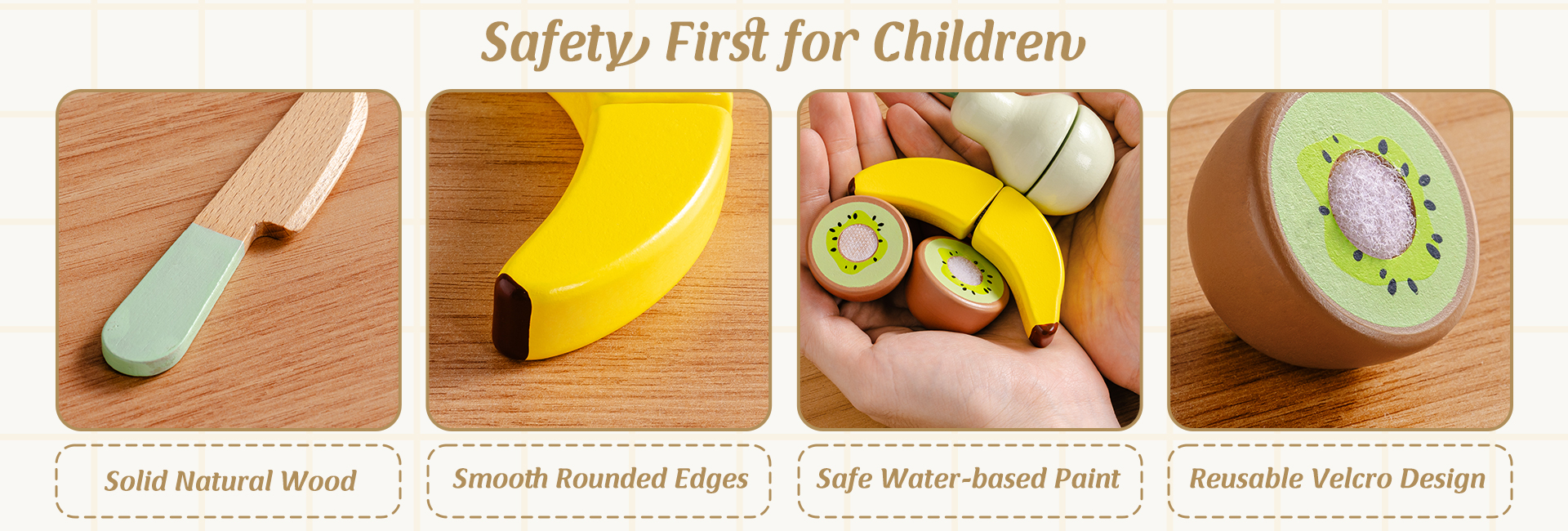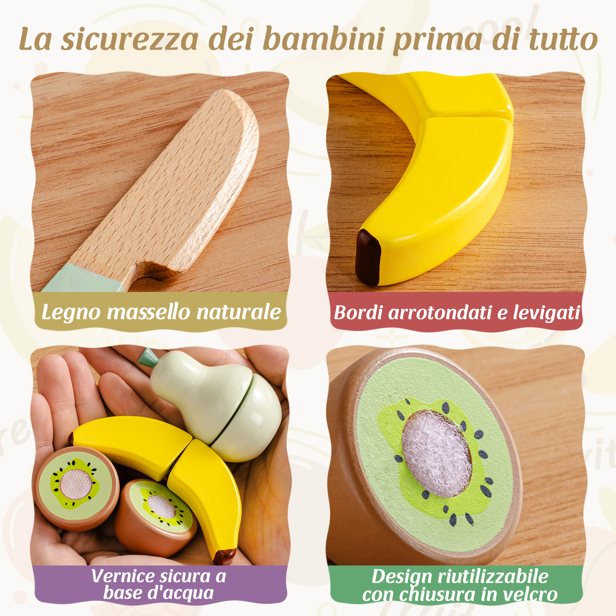 - Cibo da taglio realistico: Ogni frutto e pane può essere "tagliato" e riattaccato con il Velcro, creando un soddisfacente suono di affettatura. Questa attività pratica aiuta i bambini a esercitare la coordinazione, le abilità motorie fini e l'indipendenza.