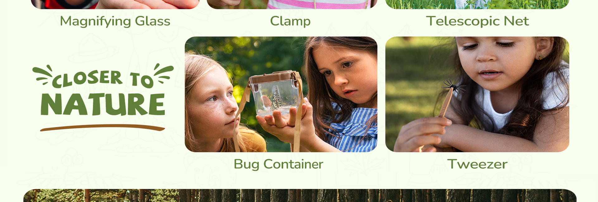 【Kit avventura tutto in uno】 Questo set completo include una lente d'ingrandimento per contenitore di insetti*1, set di schede guida*1, gabbia*1, rete telescopica*1, morsetto*1, pinzetta*1, lente d'ingrandimento*1 e borsa portatile*1. Ha tutto ciò di cui i bambini hanno bisogno per immergersi in emozionanti avventure all'aperto.