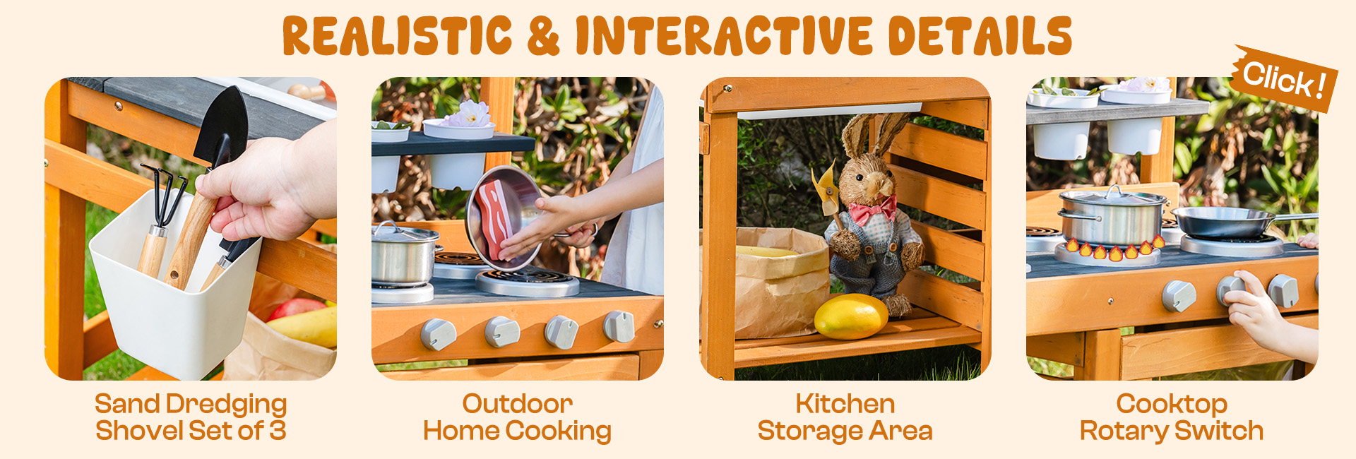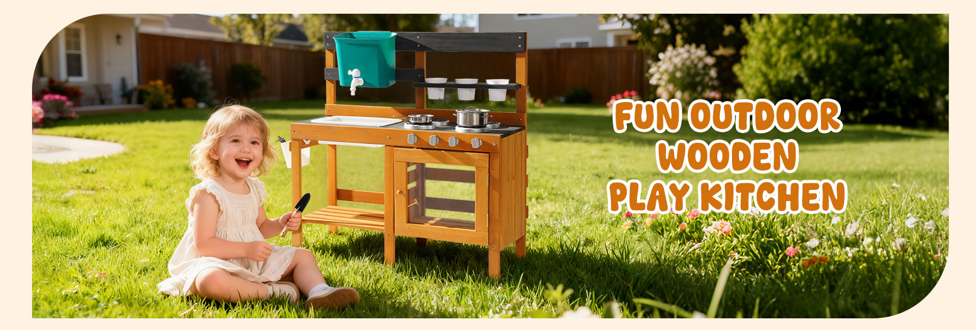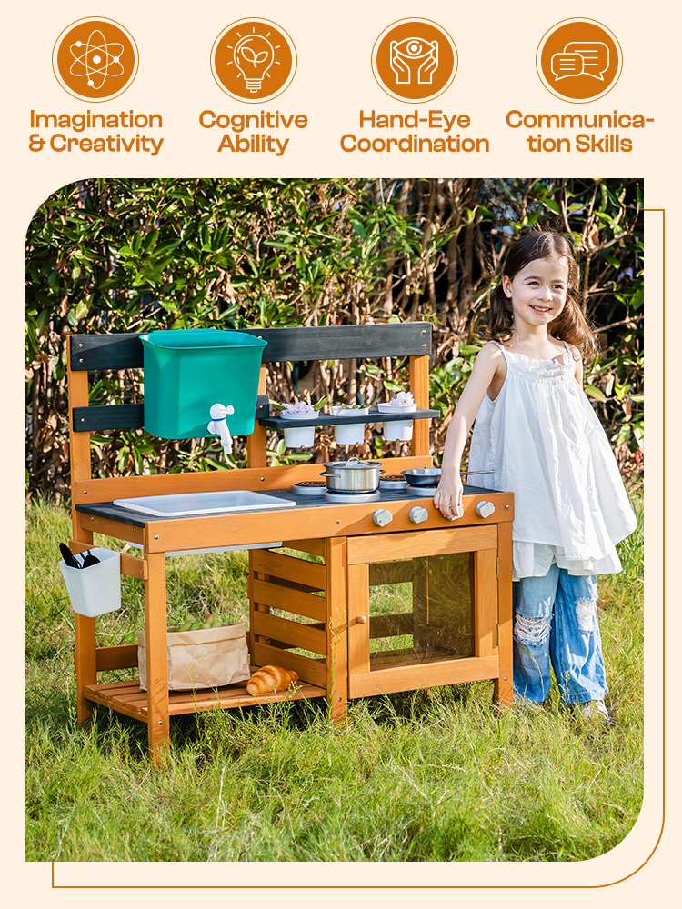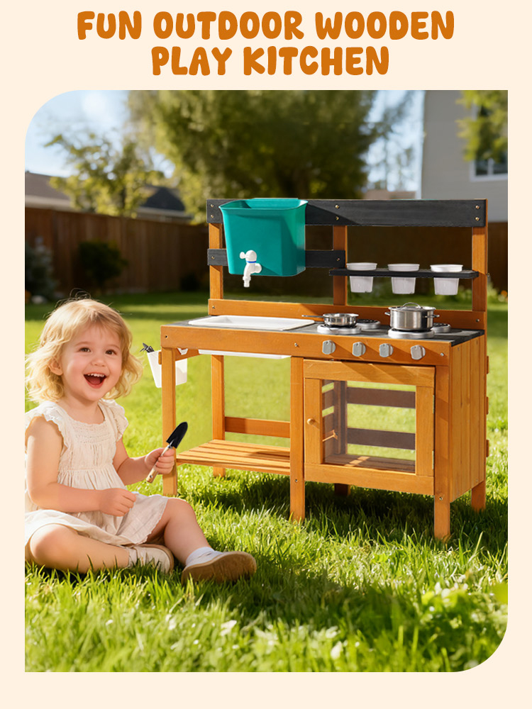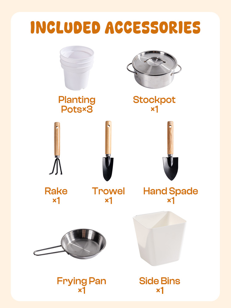 - Smart Storage & Easy Cleanup: Tieni tutto in ordine con la pratica mensola di stoccaggio! Questa cucina all'aperto per bambini offre ampio spazio per riporre pentole, attrezzi e accessori da gioco sporchi. La superficie liscia si pulisce facilmente con acqua, quindi il set da cucina per bambini è sempre pronto per la prossima sessione creativa—senza problemi, senza disordine!