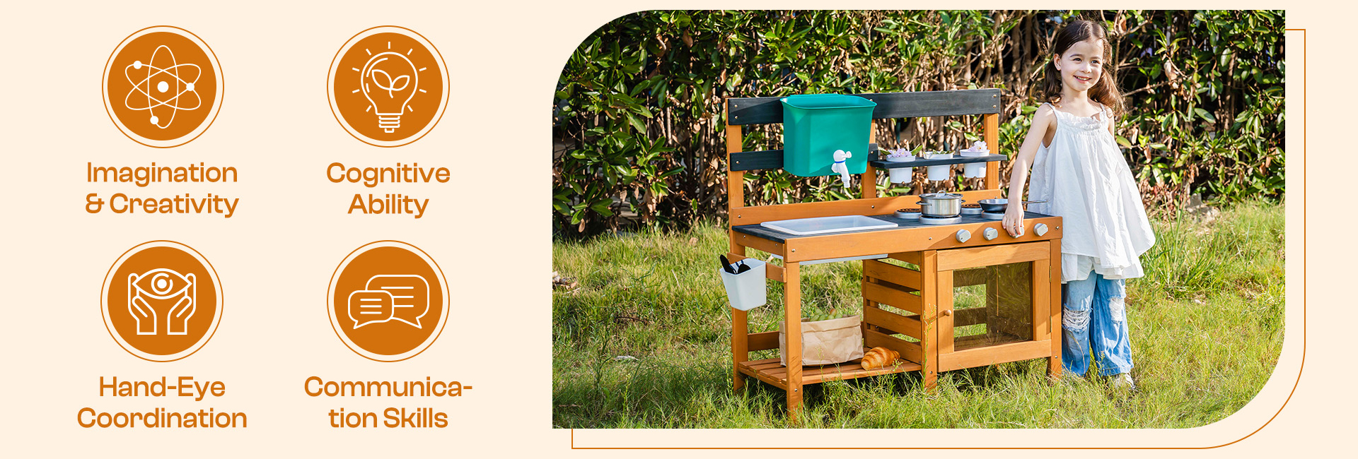 - Incoraggia la creatività e il gioco sociale: Perfetto per il gioco da solo o in gruppo, questa cucina di fango aiuta a sviluppare la comunicazione, la condivisione e il lavoro di squadra. Che si tratti di fingere di cucinare un banchetto, piantare un mini-giardino o organizzare una festa di torta di fango, tuo figlio si divertirà con infinite scenari immaginativi con questa cucina di fango per bambini—tutto mentre trascorre del tempo significativo all'aperto.