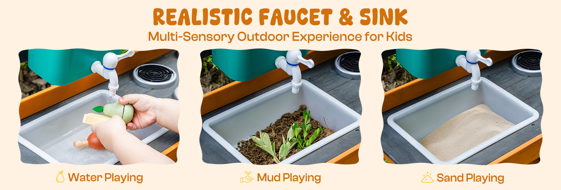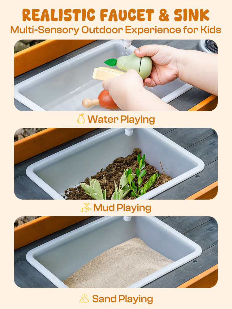 - Esperienza di Gioco con Acqua Reale: Porta il divertimento del gioco con acqua reale all'aperto! La nostra cucina di fango all'aperto per bambini include un design funzionale di rubinetto e lavello. I bambini possono lavare i giocattoli, risciacquare il fango, trasferire acqua e godere di esperimenti sensoriali. È la cucina all'aperto perfetta per bambini nelle giornate calde, incoraggiando l'immaginazione e avventure all'aperto fresche.