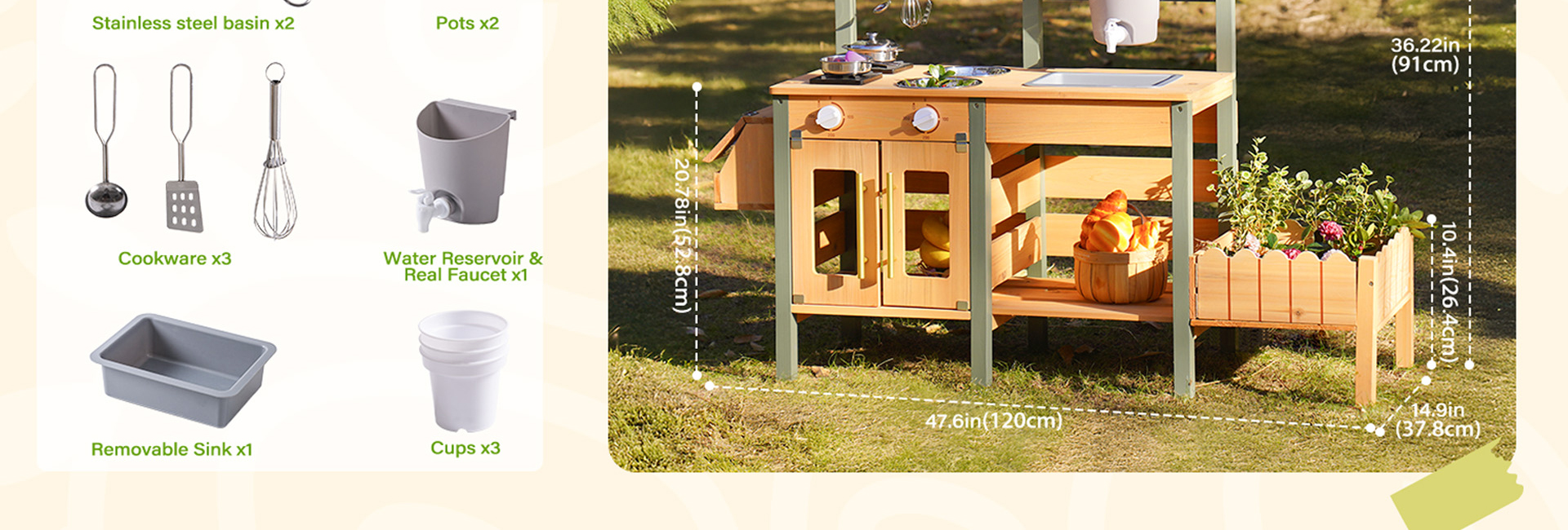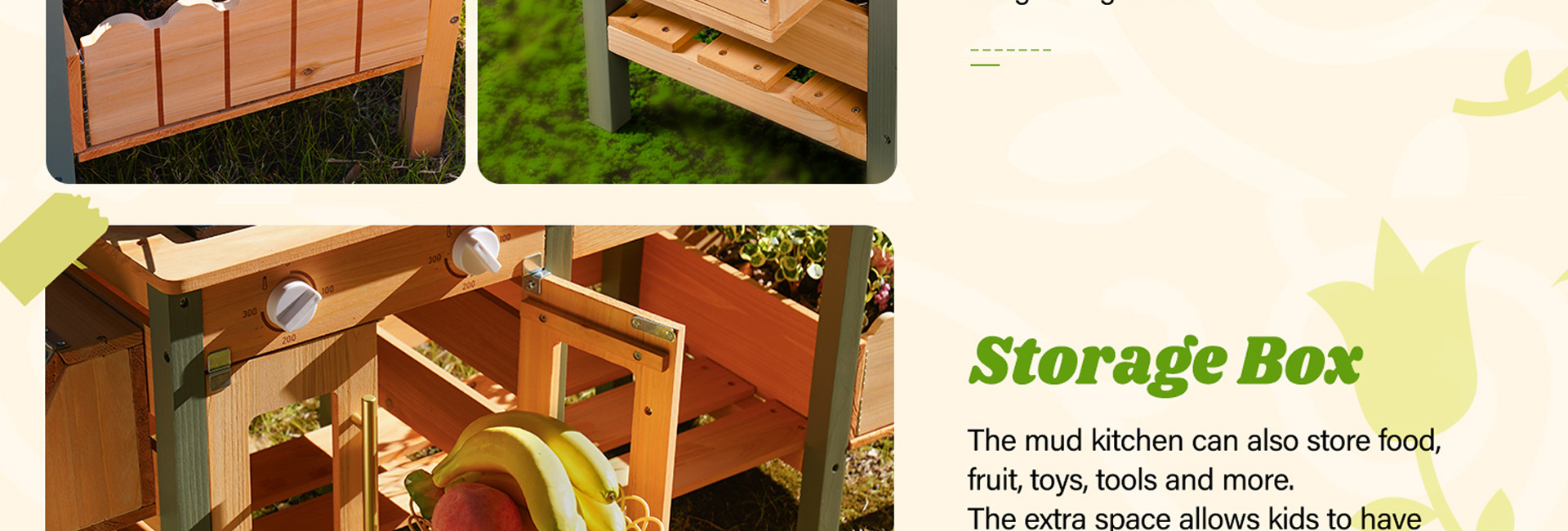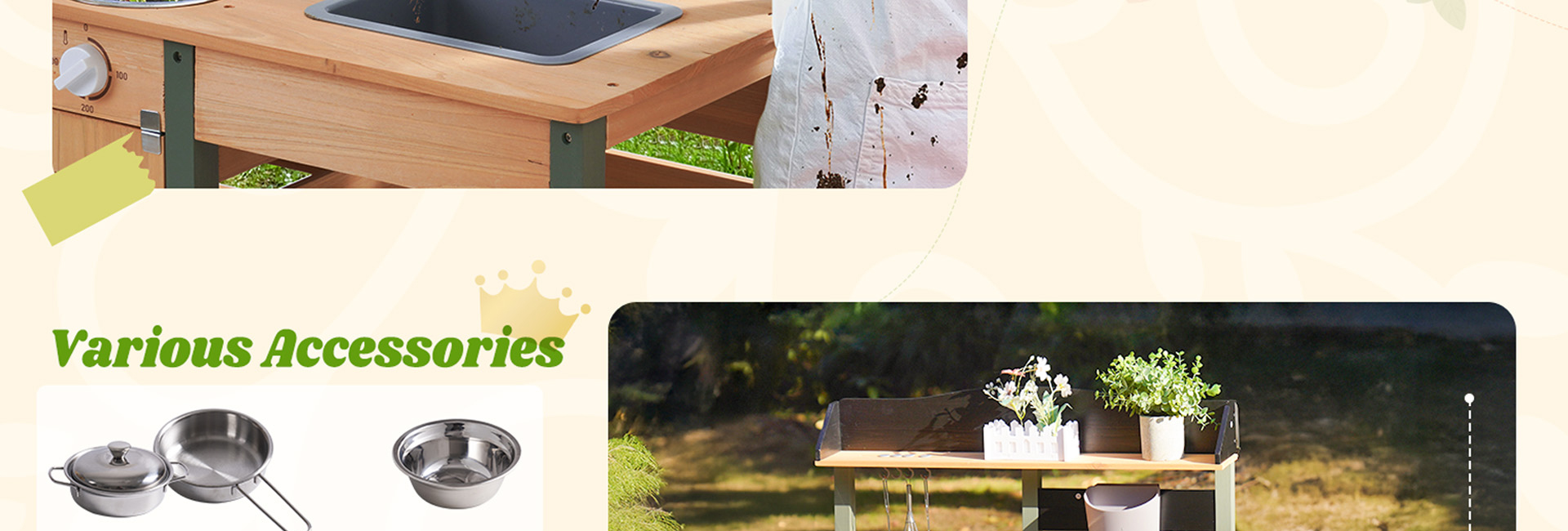 Costruzione Durevole & Sicura: Realizzata in legno di alta qualità, questa cucina di fango è costruita per durare e resistere alle condizioni esterne. Il design a misura di bambino garantisce un gioco sicuro con bordi lisci e una costruzione robusta per ore di divertimento.
