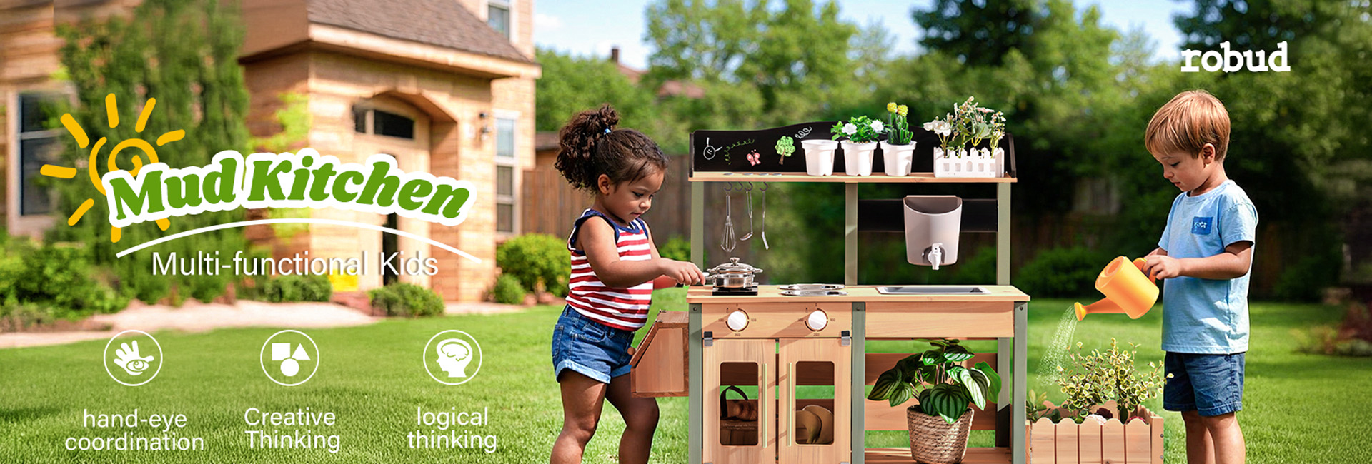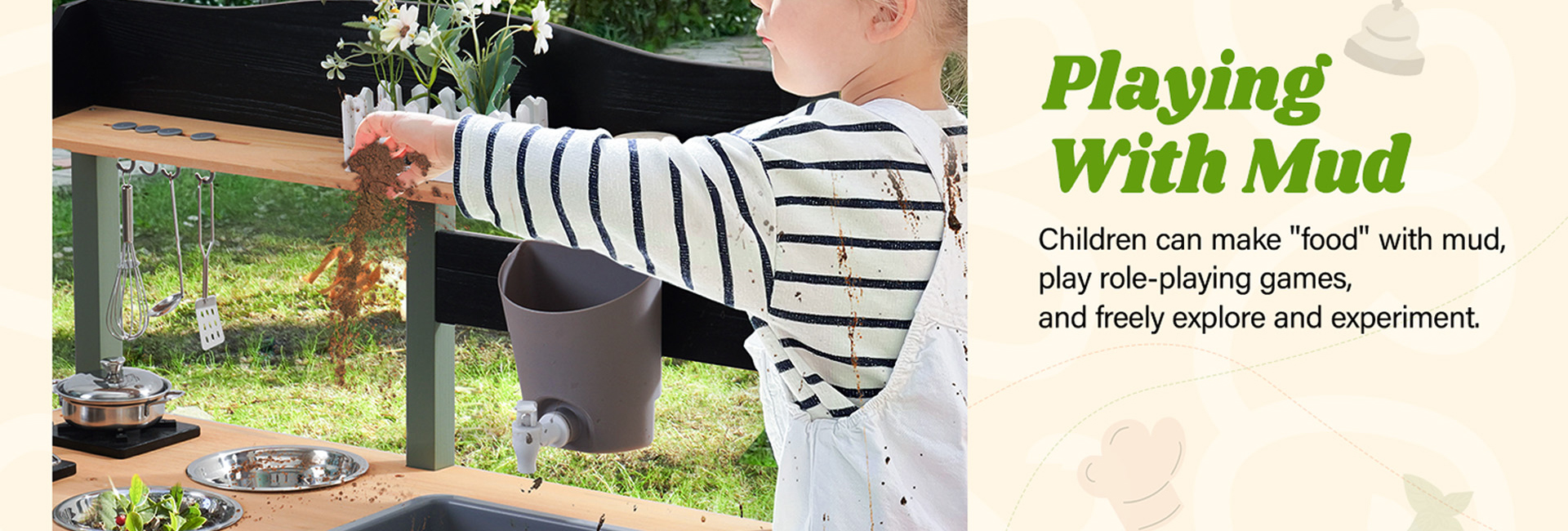 Gioco all'aperto & Apprendimento: La Cucina di Fango ROBUD è progettata per i bambini piccoli per impegnarsi nel gioco all'aperto, combinando sabbia, acqua e fango per esperienze di cucina realistiche. Perfetta per sviluppare il gioco immaginativo e attività pratiche nella natura.