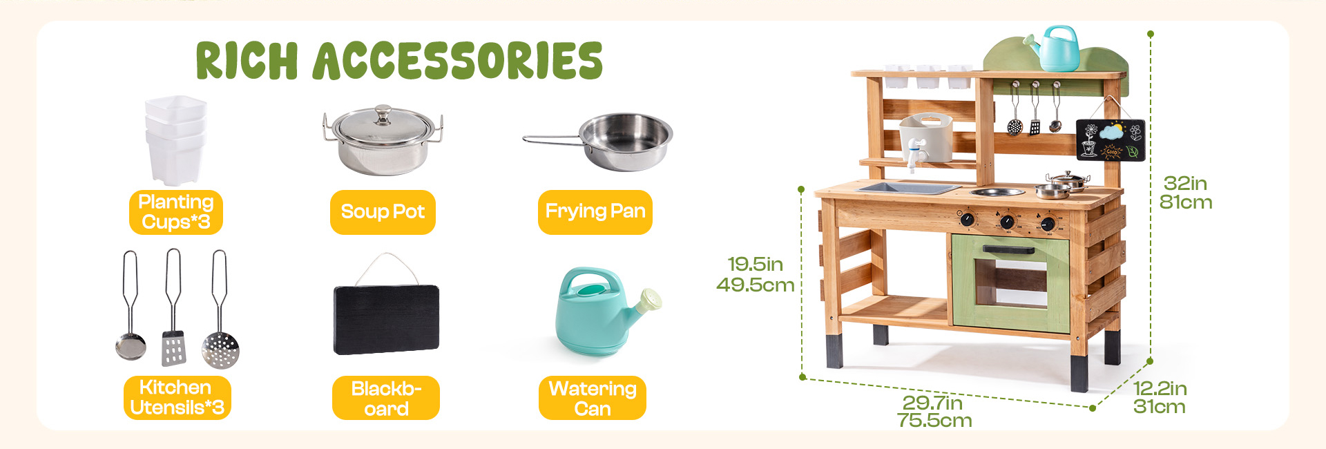 - 【Ample Storage Solutions】La nostra cucina in legno per bambini include un ampio ripiano di stoccaggio inferiore, un grande forno, un tavolo spazioso, un ripiano di stoccaggio superiore e tre ganci aggiuntivi - perfetti per riporre tazze, utensili e materiali da gioco. Tutto trova il suo posto in questa cucina da esterno ben organizzata per bambini.