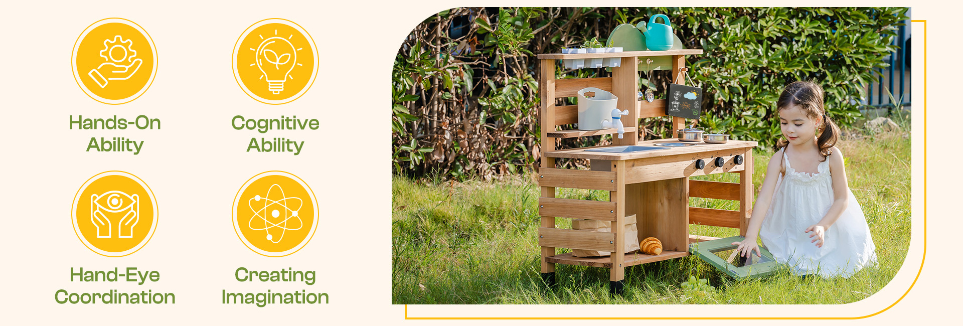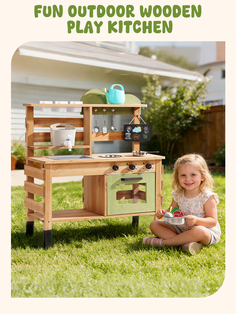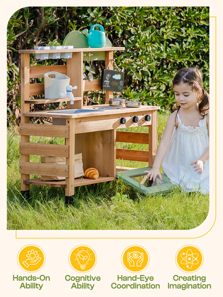 - 【Scoperta Della Natura ed Esplorazione All'aperto】Questa Cucina di Fango all'Aperto per Bambini motiva i bambini a esaminare elementi naturali, sperimentare con le texture (fango, acqua, fogliame) e impegnarsi in un gioco fisico senza schermo. È la grande Cucina da Gioco all'Aperto per stimolare curiosità e gioia sotto il cielo aperto!