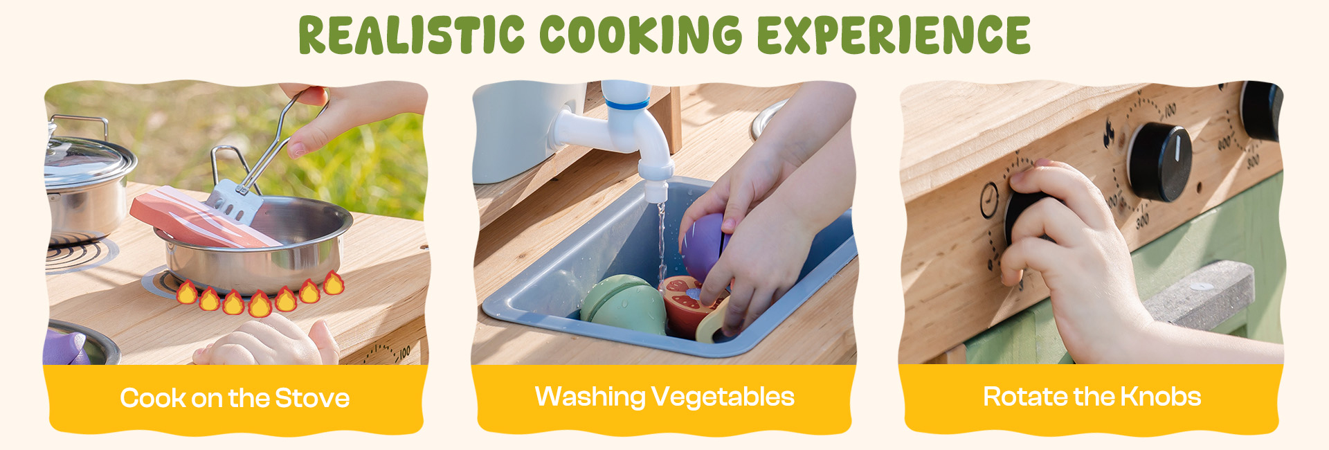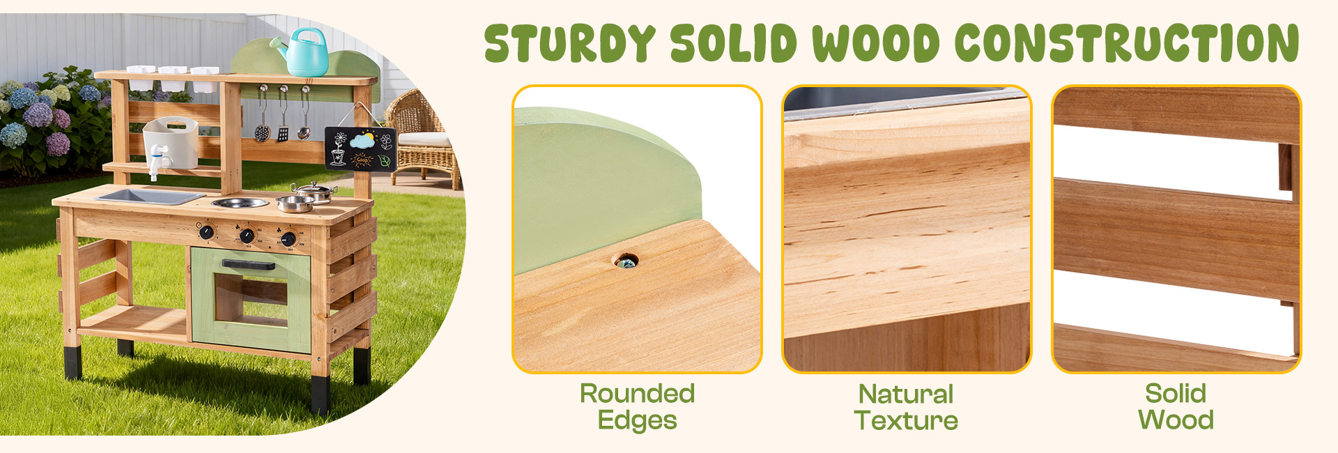 - 【Costruzione Durevole e Sicura per Bambini】Realizzata in legno robusto e trattato per resistere alle intemperie, questa Cucina da Esterno per Bambini combina bordi arrotondati, rivestimenti non tossici e stabilità solida come una roccia. Soddisfa gli standard di sicurezza ASTM attraverso test di sicurezza approfonditi, dando ai genitori fiducia e tranquillità.