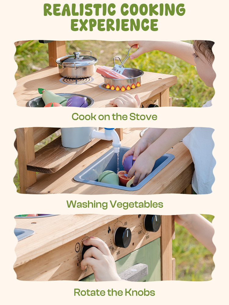 - 【Sviluppa l'immaginazione e Le Abilità Sociali】La nostra Cucina per Bambini in Fango all'Aperto include una lavagna a doppio lato per la pianificazione del menu. E il design realistico della cucina incoraggia i bambini a impegnarsi nel gioco di ruolo. Così, la nostra Cucina per Bambini all'Aperto stimola naturalmente l'immaginazione e promuove la cooperazione nel lavoro di squadra, trasformando il tempo di gioco in preziose esperienze di apprendimento sociale.
