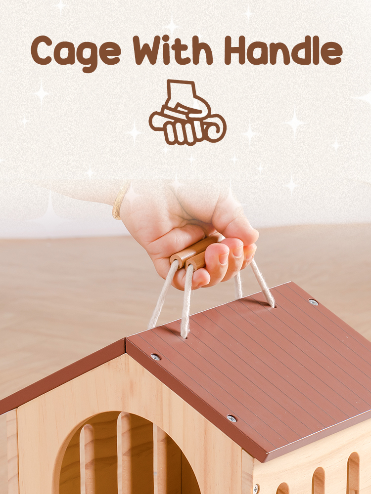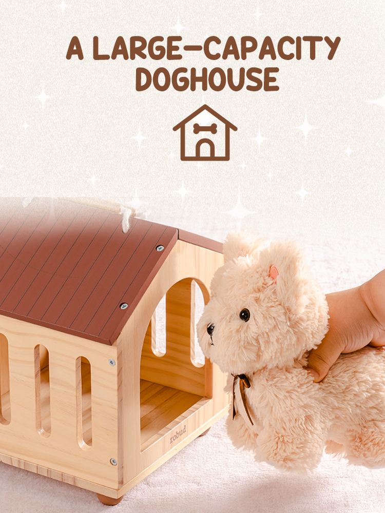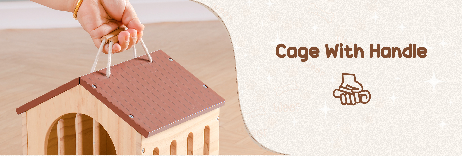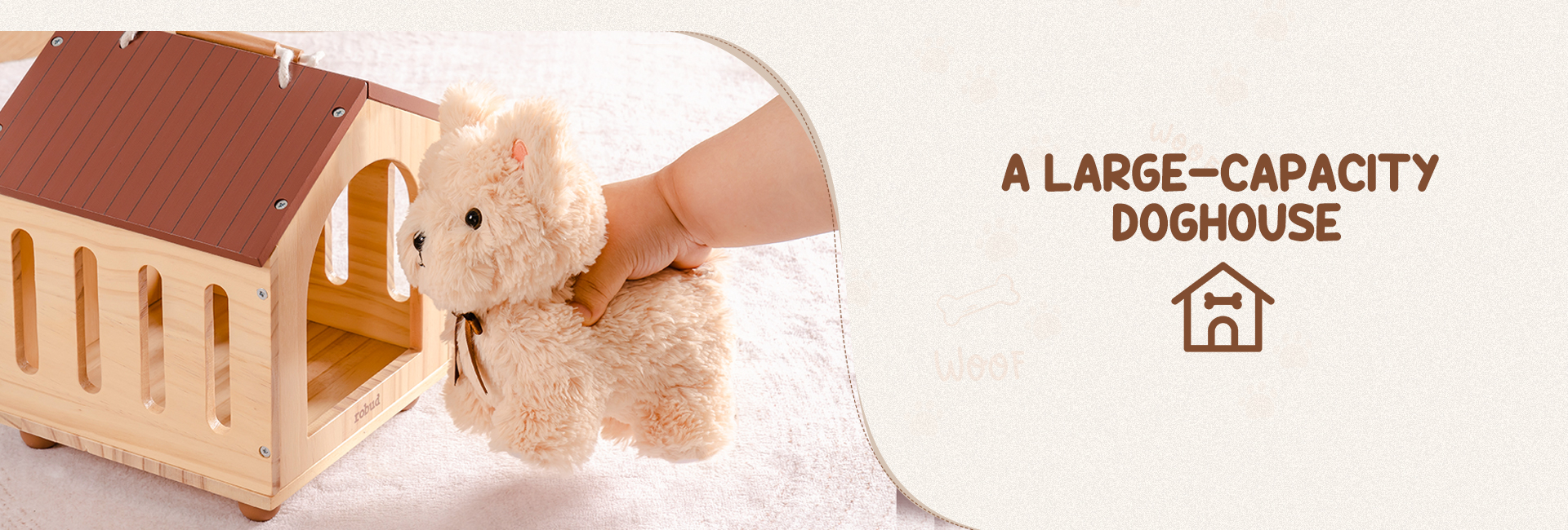 - Casa per Cani con Manico: Include una casa per cani in legno, progettata con lati a listelli e una corda per il trasporto per una facile portabilità e stoccaggio. La struttura aperta aggiunge realismo e invita i bambini a creare storie sugli animali domestici.