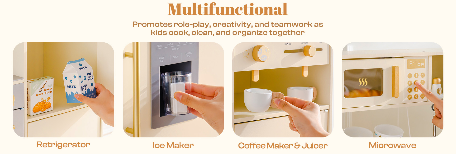 - DESIGN AMICO DEI BAMBINI: La cucina giocattolo è realizzata in legno robusto ed è stata levigata. La sua superficie è liscia e priva di schegge. Gli angoli arrotondati, le maniglie facili da afferrare e i componenti anti-rottura garantiscono una lunga durata - rendendola altamente adatta per bambini oltre i 3 anni. La neutra combinazione di colori crema mantiene un aspetto alla moda in qualsiasi area di gioco.