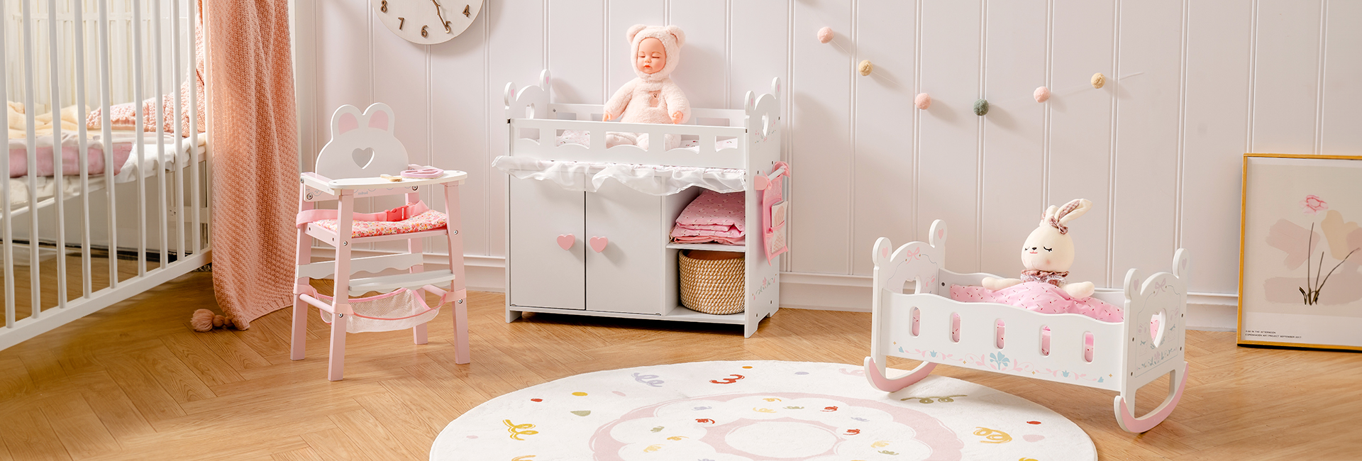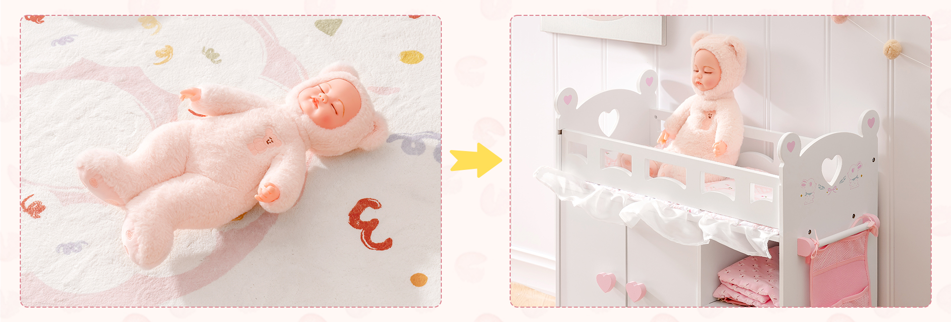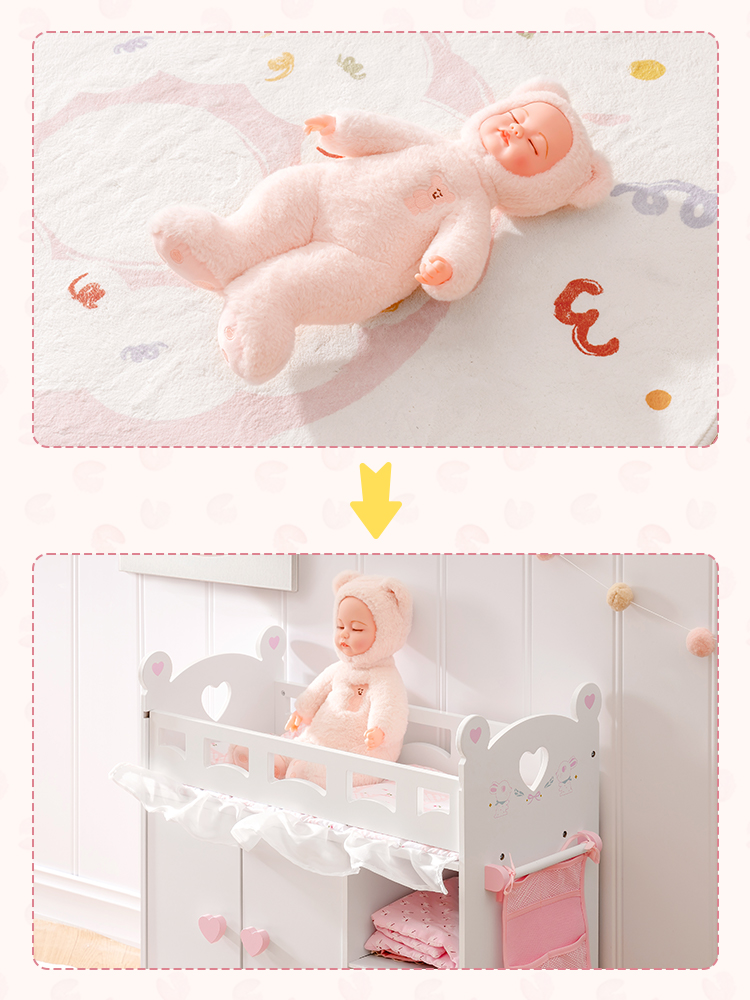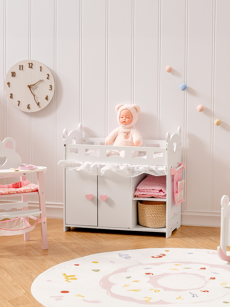 【Molti modi divertenti per giocare】Da giocattoli in legno classici a set di gioco di ruolo realistici, i prodotti per lettini per bambole ispirano l'immaginazione e la curiosità dei bambini attraverso modi di giocare senza schermo e illimitati! Allo stesso tempo, questi giochi di ruolo che simulano la vita reale aiuteranno tuo figlio a migliorare le abilità linguistiche e la coordinazione.