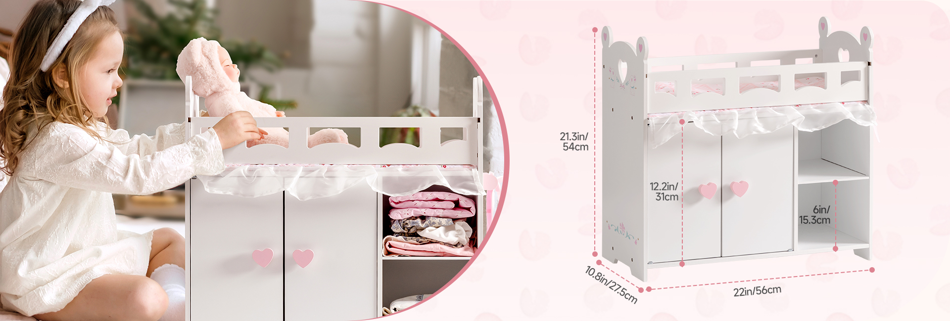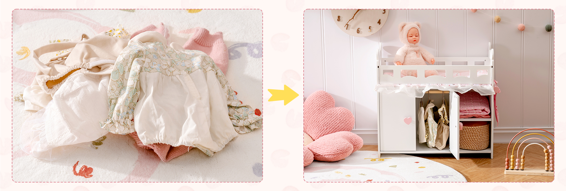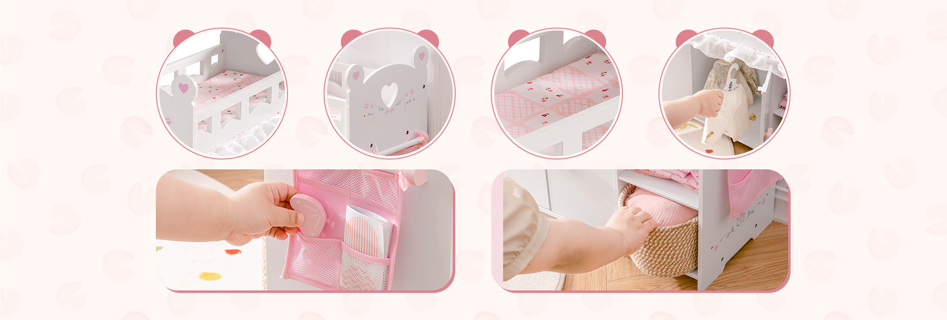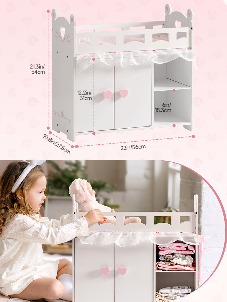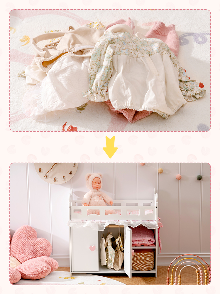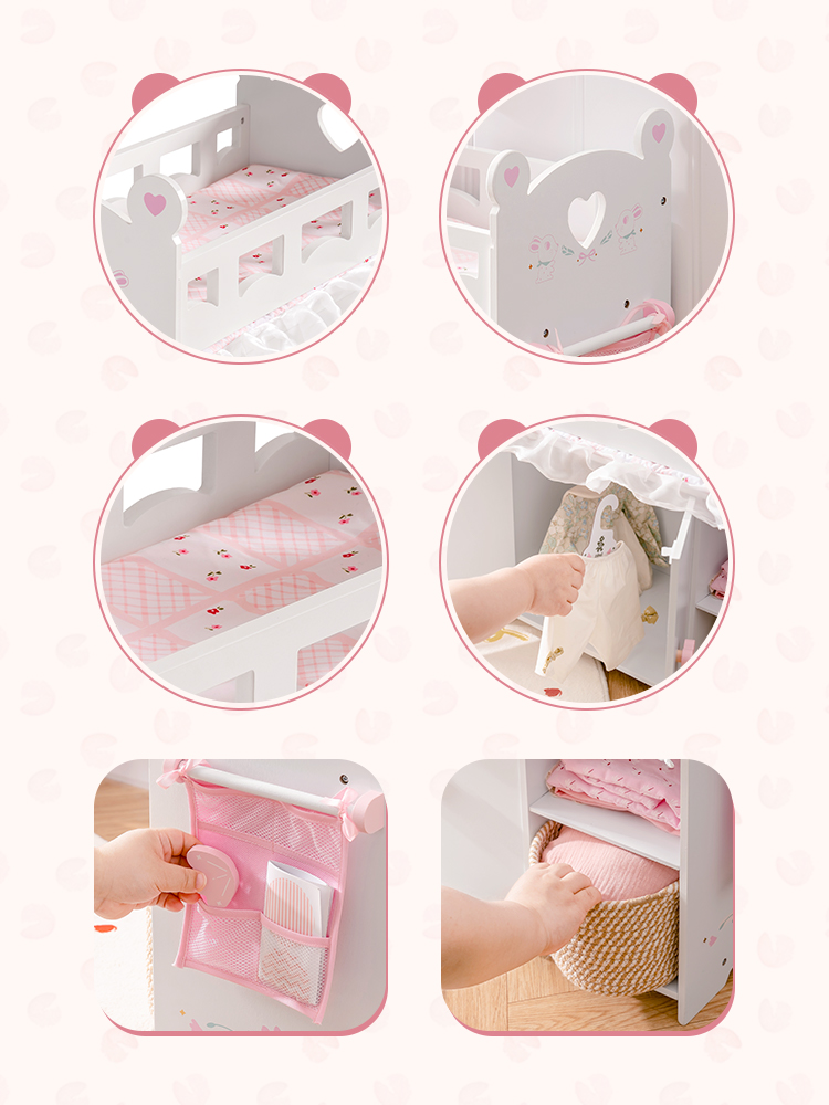 【Set di lettini per bambole】Questo lettino per bambole combina lettino, armadio per bambole e funzioni di stoccaggio in uno! Il nostro lettino per bambole ha più aree per riporre vestiti per bambole, giocattoli e articoli per neonati simulati. Il nostro giocattolo lettino per neonati non solo ha uno spazio di stoccaggio più grande, simula un vero armadio e insegna ai bambini come organizzare i vestiti, ma contiene anche una borsa di stoccaggio extra e 3 appendini e un set di biancheria da letto in tre pezzi, che sono comodi per i bambini per riporre vestiti per bambole, accessori e altre necessità.