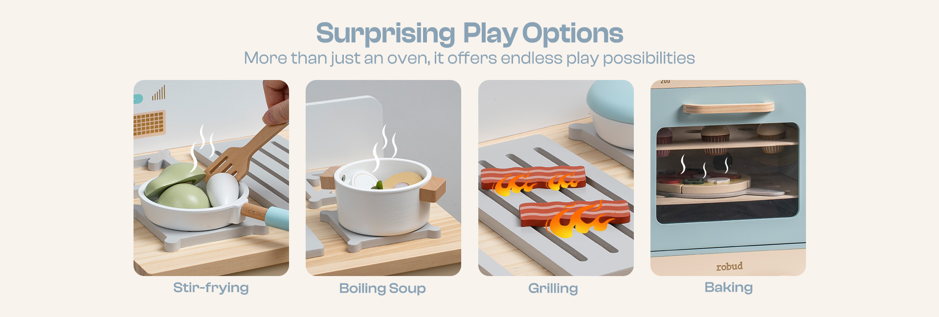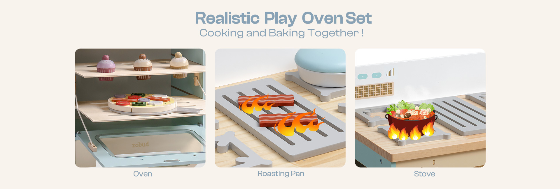 DESIGN CREATIVO: Il forno giocattolo ROBUD è realizzato con cura meticolosa e creatività senza limiti. Ogni dettaglio, dal suo aspetto carino alle sue caratteristiche realistiche, è stato scolpito con attenzione per evocare un senso di stile e calore per i bambini durante il gioco.