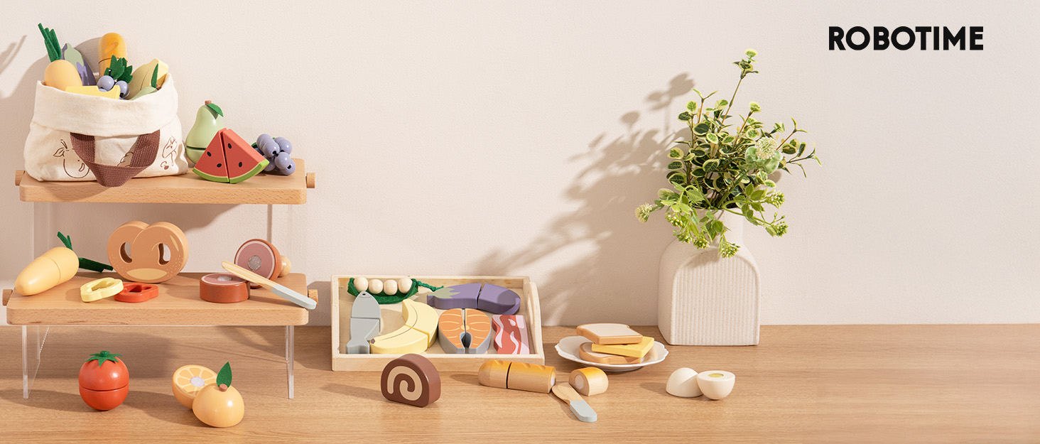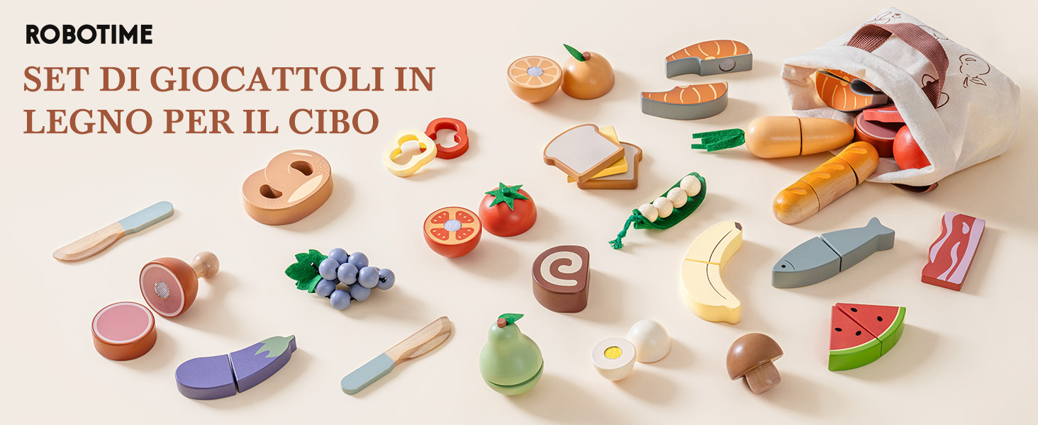 - DIVERTIMENTO IN CUCINA: Stimola l'immaginazione di tuo figlio con il set di cibo in legno ROBUD, che presenta un assortimento colorato di frutta, verdura, pane, pesce e altro ancora da affettare. Da banane a salmone, e persino un filone di pane, ogni elemento è progettato per imitare il cibo reale per un gioco di ruolo in cucina realistico. Un compagno perfetto per qualsiasi cucina da gioco per ore di divertimento creativo!
