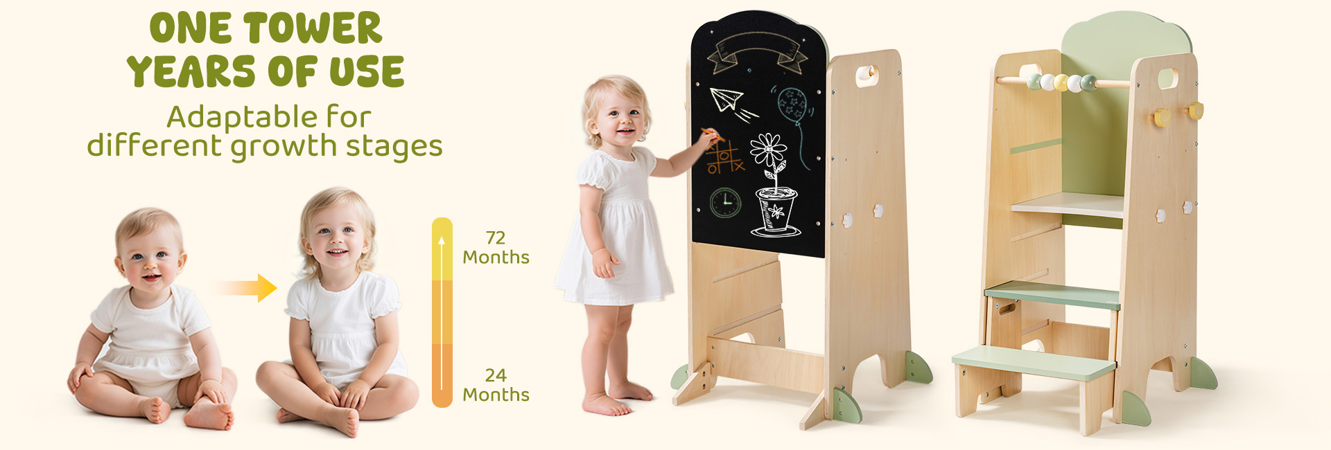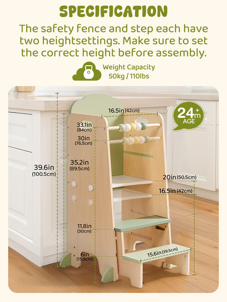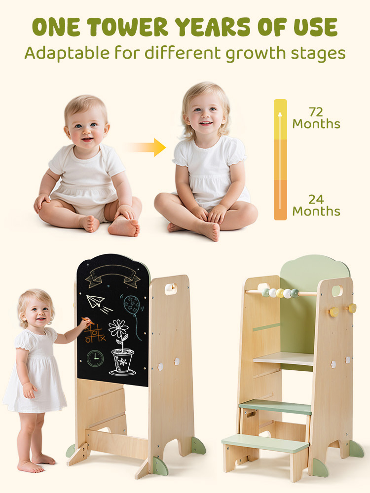 - Design Altezza Regolabile---La torre standing cresce con il tuo bambino, con gradini regolabili e sbarre protettive. I genitori possono impostare l'altezza per adattarsi ai bambini in diverse fasi, garantendo un uso sicuro mentre supportano la curiosità dei bambini. È un design pensato che accompagna i bambini per anni.