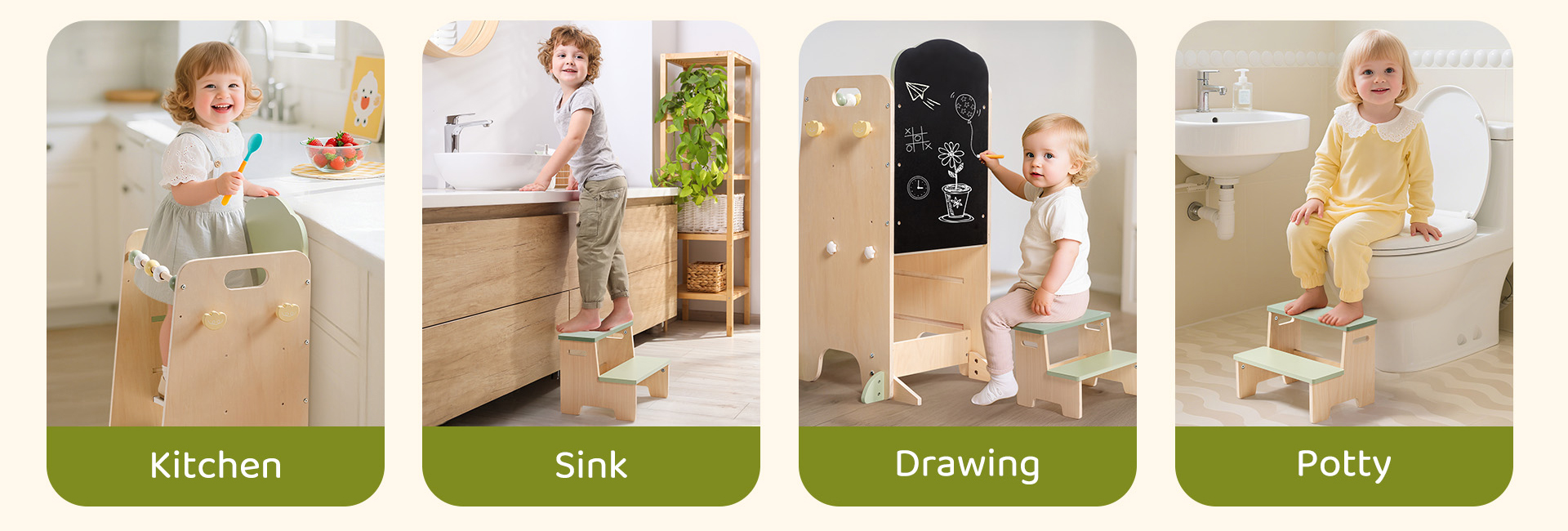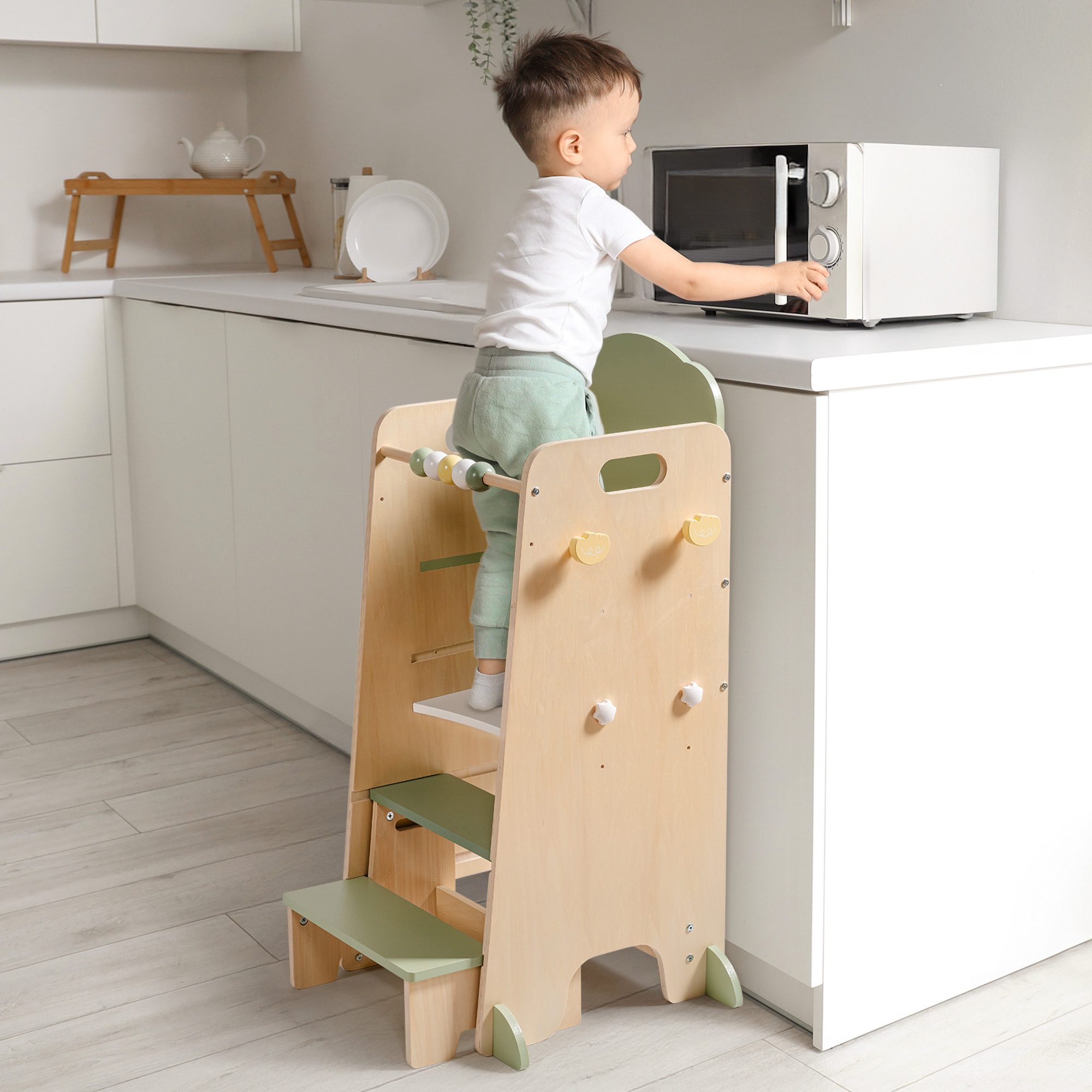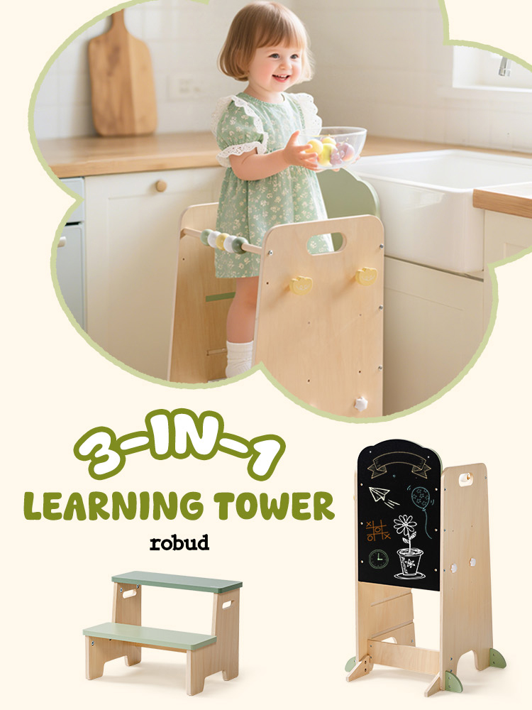 - Negozio Finto E Divertimento Di Gioco---Quando i bambini crescono un po', i due poggiapiedi possono essere utilizzati come scaffali, trasformando la torre in un piccolo negozio. I bambini possono sedersi sullo sgabello, "vendere" prodotti e godere di un gioco di ruolo immaginativo. Questa configurazione creativa rende la torre non solo un mobile, ma un giocattolo duraturo di grande valore.