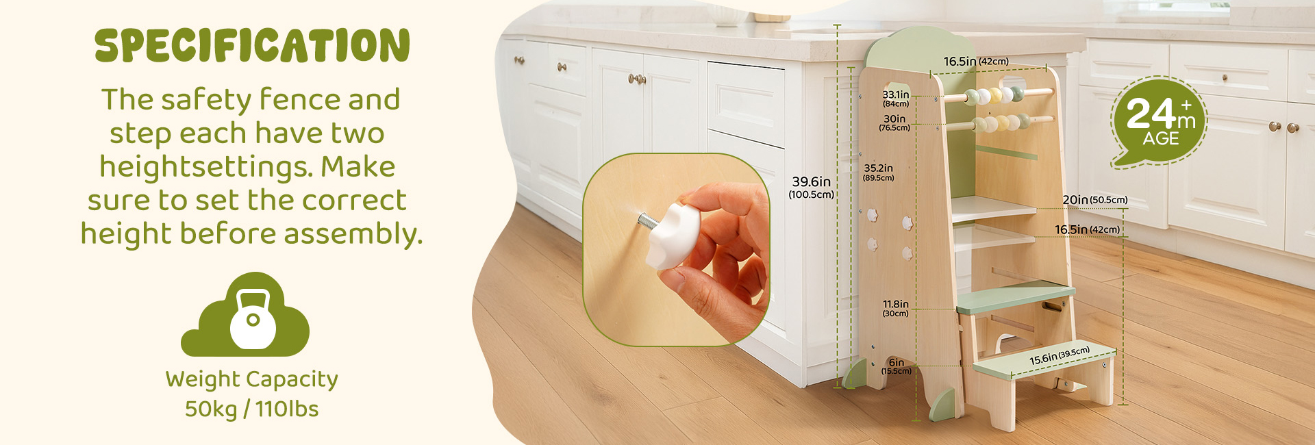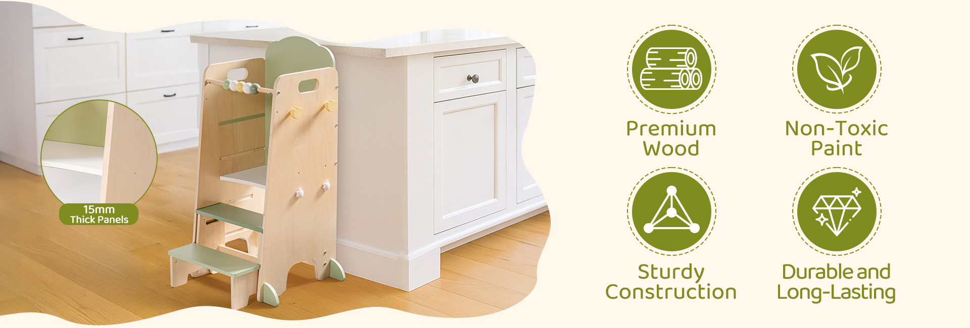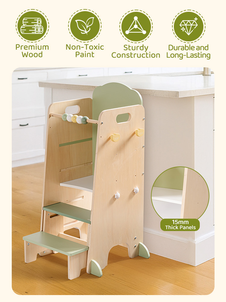 - Struttura Sicura E Robusta---Realizzata in legno massello con una struttura stabile, la torre garantisce durata e sicurezza. Gli angoli arrotondati e le superfici lisce proteggono i bambini da graffi, mentre le caratteristiche antiscivolo aggiungono ulteriore stabilità. I genitori possono fidarsi di essa come un aiuto quotidiano affidabile.