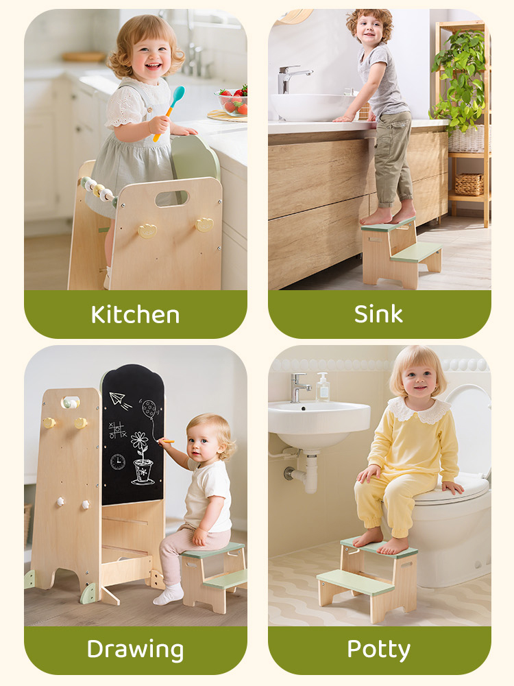 - Set Torre Standing 2-In-1---Questo set include una torre standing per bambini e uno sgabello abbinato, offrendo un uso multifunzionale sia in cucina che in bagno. I bambini possono partecipare alla cucina o lavarsi i denti in modo indipendente, incoraggiando la fiducia in sé e l'autosufficienza. Perfetto per le routine quotidiane e l'interazione genitore-figlio.