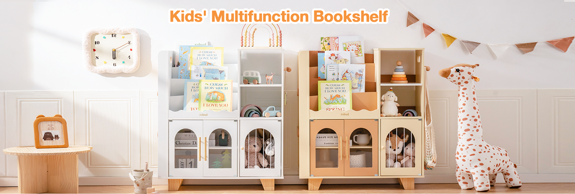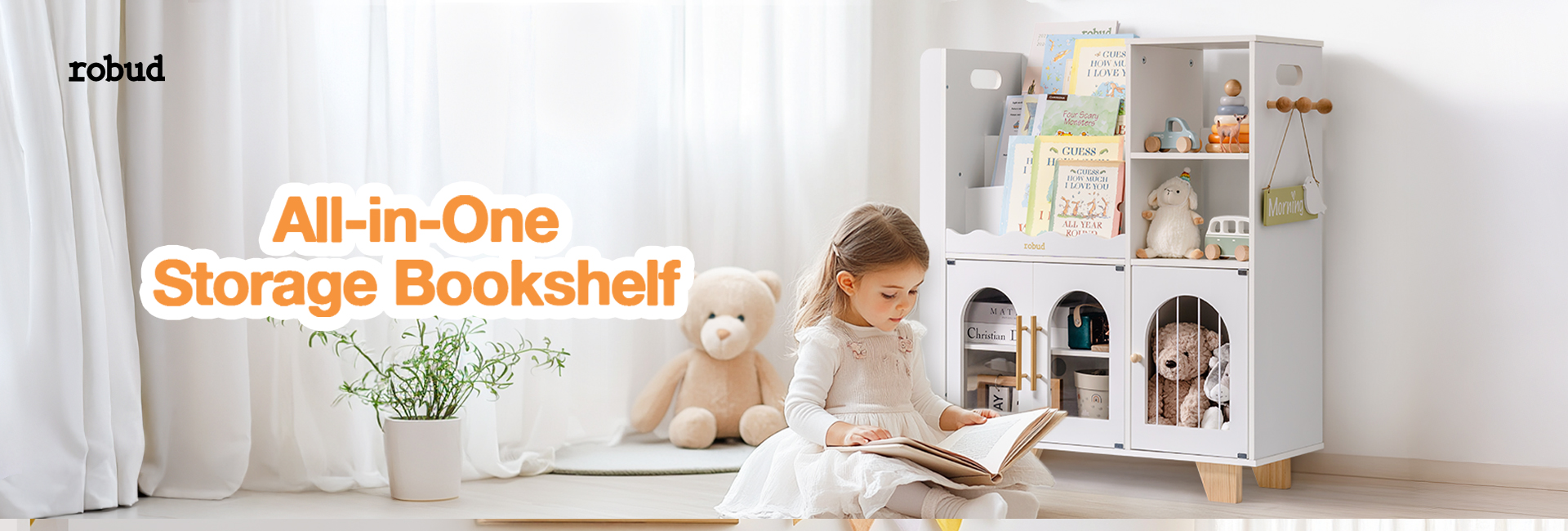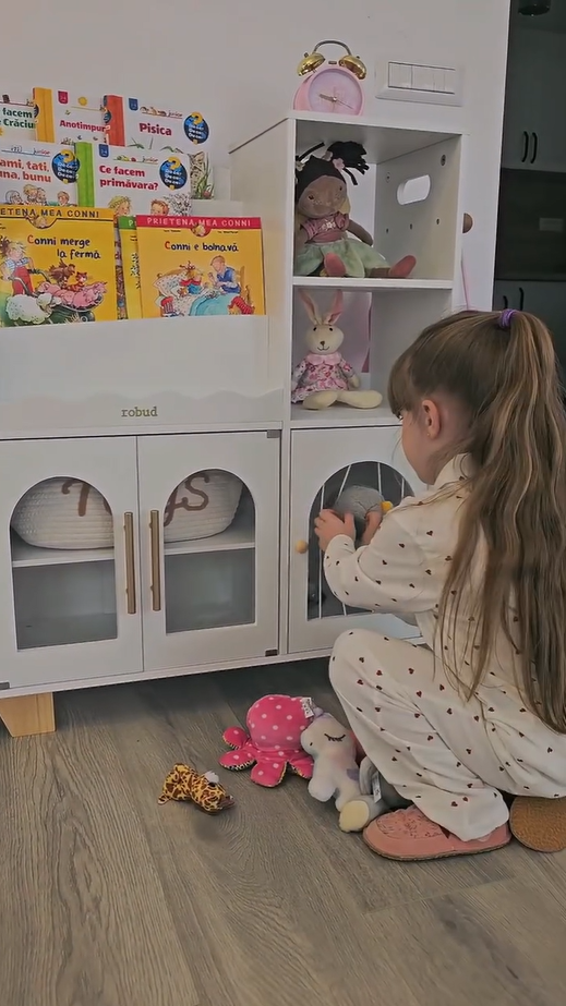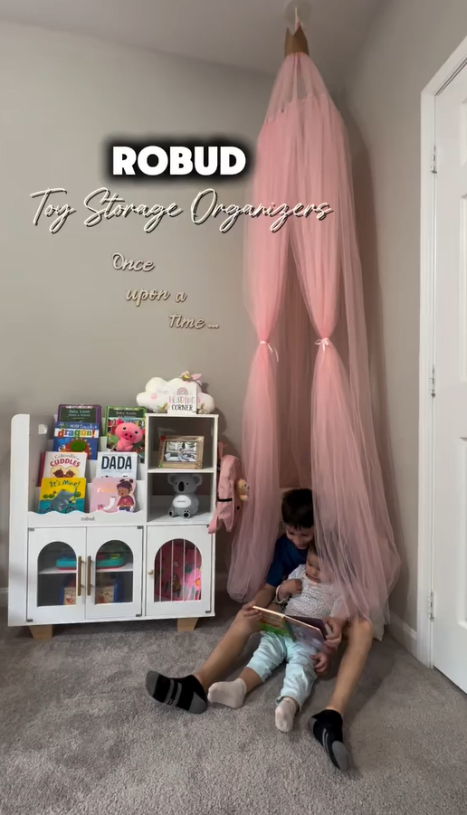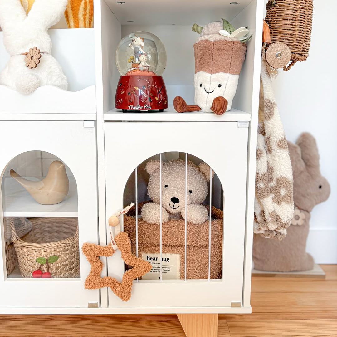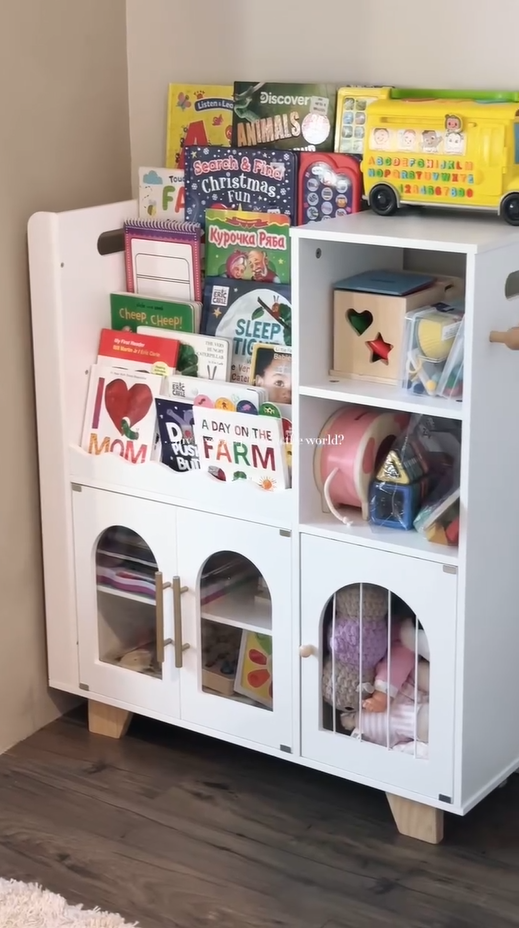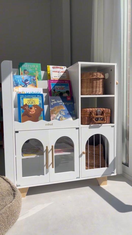 ORGANIZZATORE PER GIOCHI 6-IN-1: Mantieni la stanza dei giochi o la camera da letto del tuo bambino ordinata e pulita con questo versatile organizzatore! Dotato di uno scaffale per libri a più livelli, libreria, ripiani aperti, eleganti armadietti con porte ad arco, uno scaffale per libri montato lateralmente e ganci, offre un perfetto spazio di stoccaggio per libri, giocattoli, materiali artistici e altro ancora.