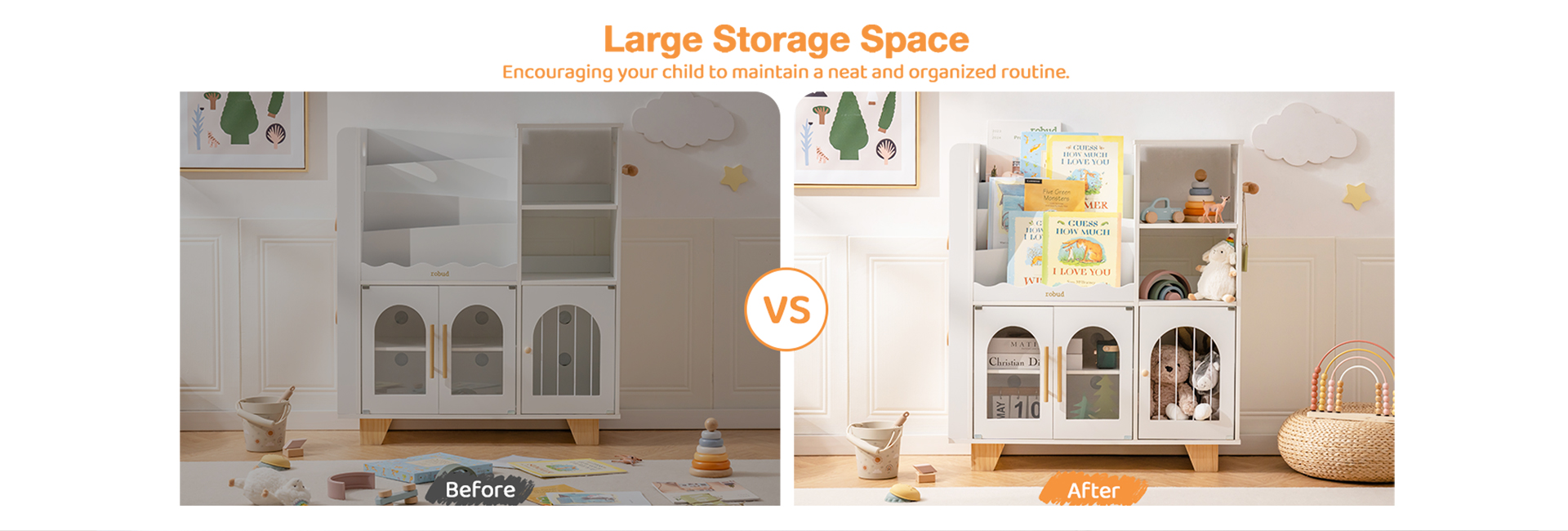 COSTRUZIONE DUREVOLE E ROBUSTA: Progettato per durare, questo scaffale e unità di stoccaggio per giocattoli è realizzato in legno pregiato con una superficie resistente ai graffi. Può affrontare le esigenze dei bambini attivi, offrendo un uso a lungo termine rimanendo stabile e sicuro per le manine piccole.