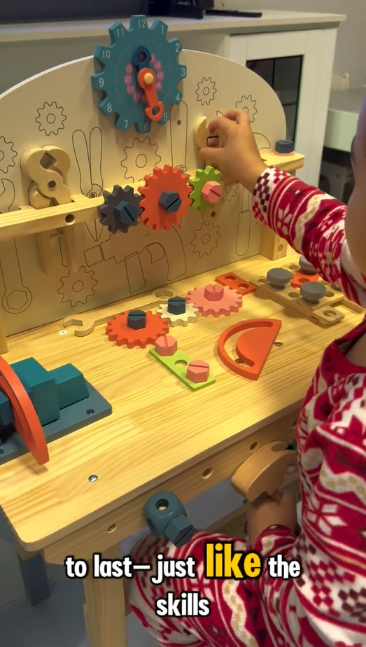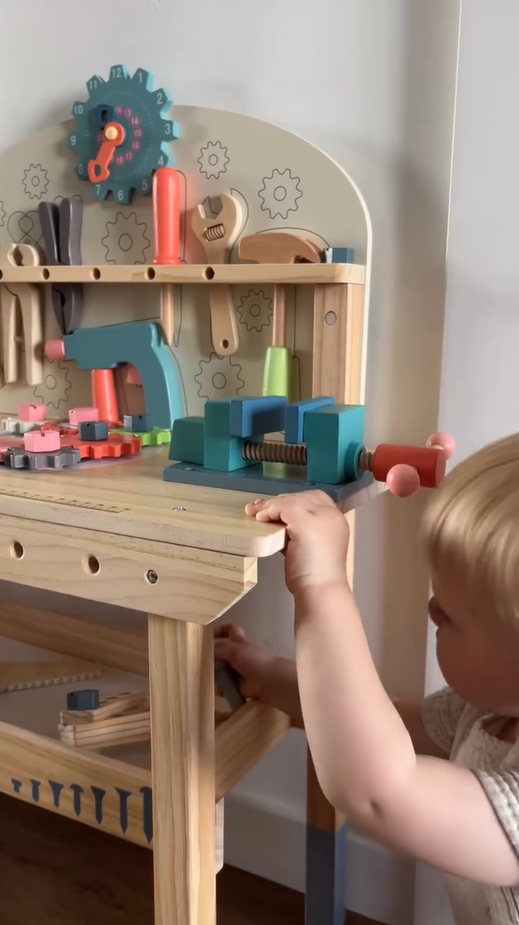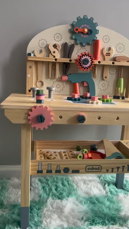 【Materiale sicuro】 Ogni pezzo del banco degli attrezzi ROBUD è realizzato in legno 100% reale con vernice a base d'acqua non tossica e sicura per i bambini. Ogni articolo è ben realizzato con bordi arrotondati; la superficie è accuratamente levigata e liscia senza sbavature, in modo da non danneggiare le mani e la pelle delicate dei bambini durante il gioco.