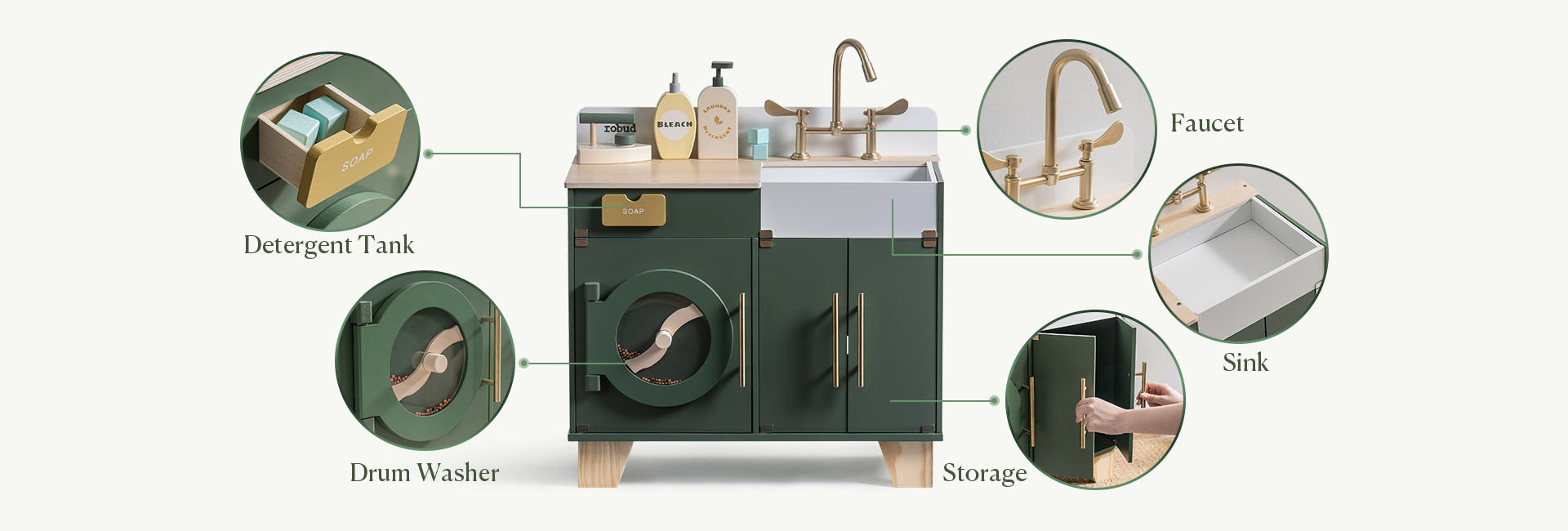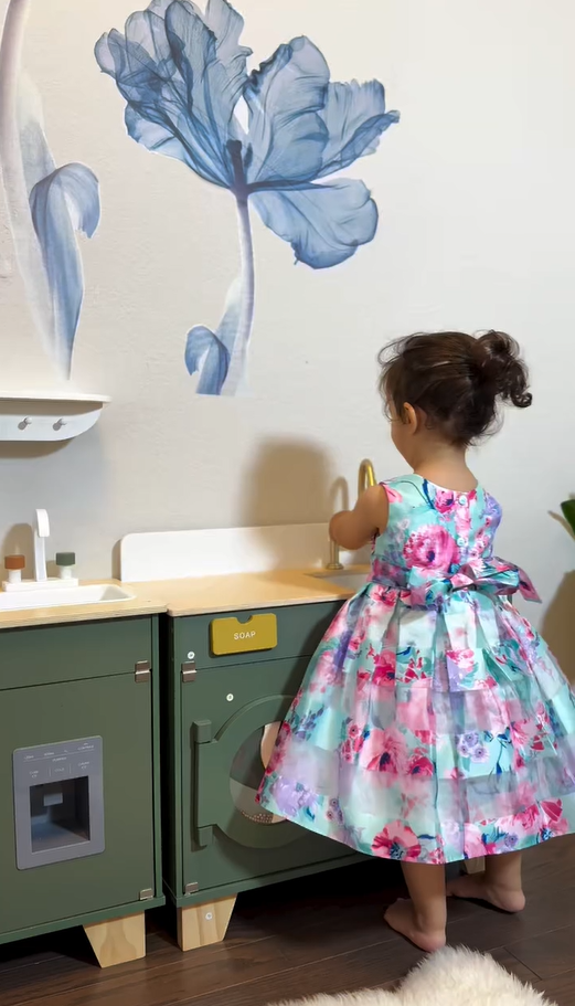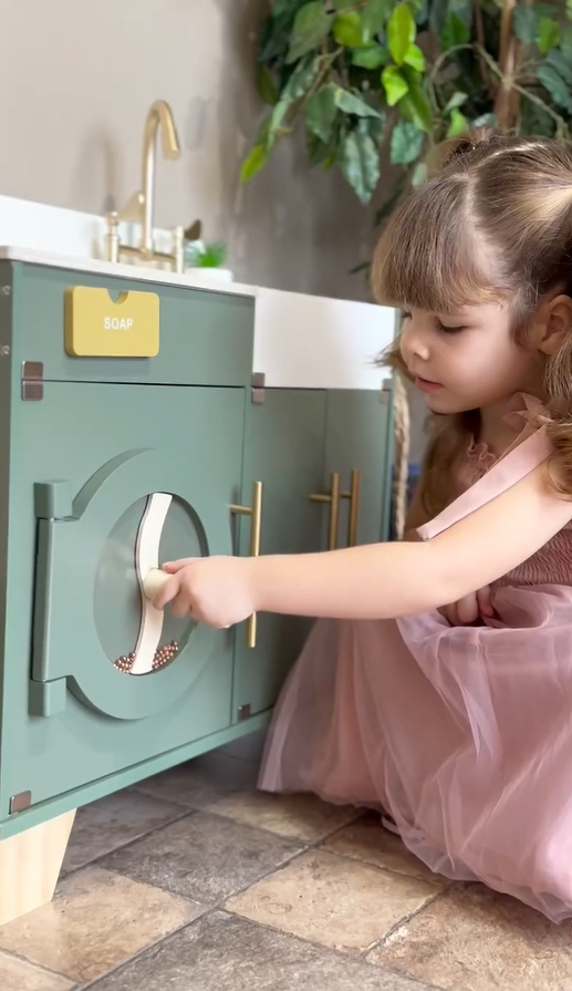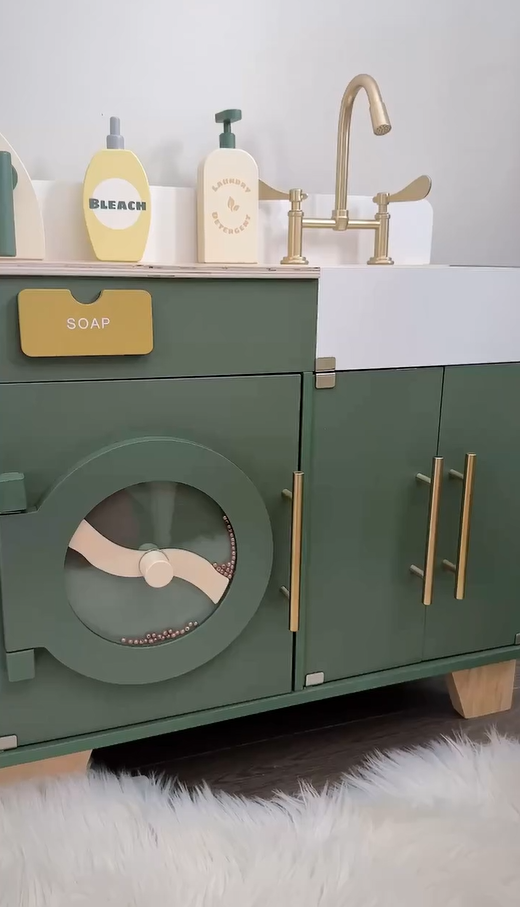 - 🛁 Piacere di Stoccaggio Interattivo 🛁 Scopri le caratteristiche di design intelligente che elevano l'interazione e l'organizzazione all'interno di questo incantevole set! L'armadietto a doppia porta sotto il lavandino offre ampio spazio di stoccaggio per giocattoli e articoli per la lavanderia, promuovendo aree di gioco ordinate e un facile accesso agli accessori. Goditi il design interno a rulli della lavatrice che rispecchia i processi di lavaggio reali con un suono frusciante e giocoso, migliorando l'esperienza di gioco immersiva e interattiva per i tuoi piccoli.