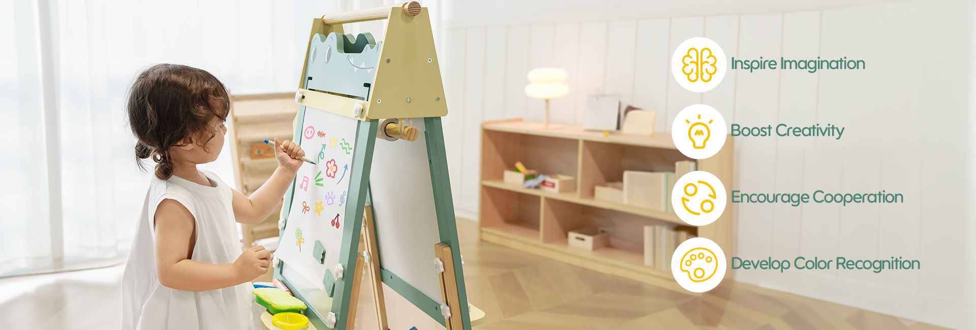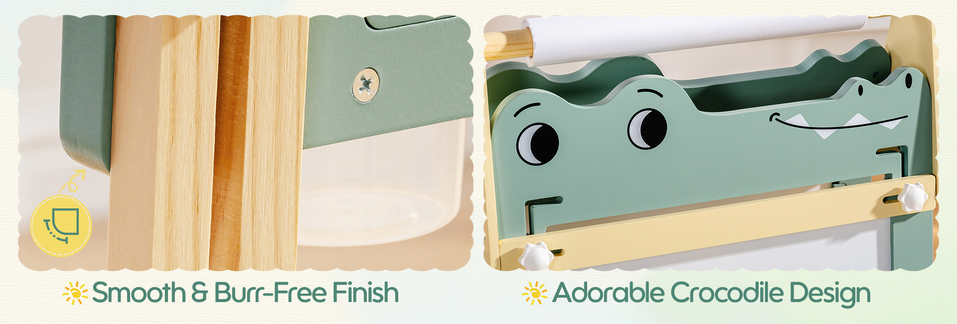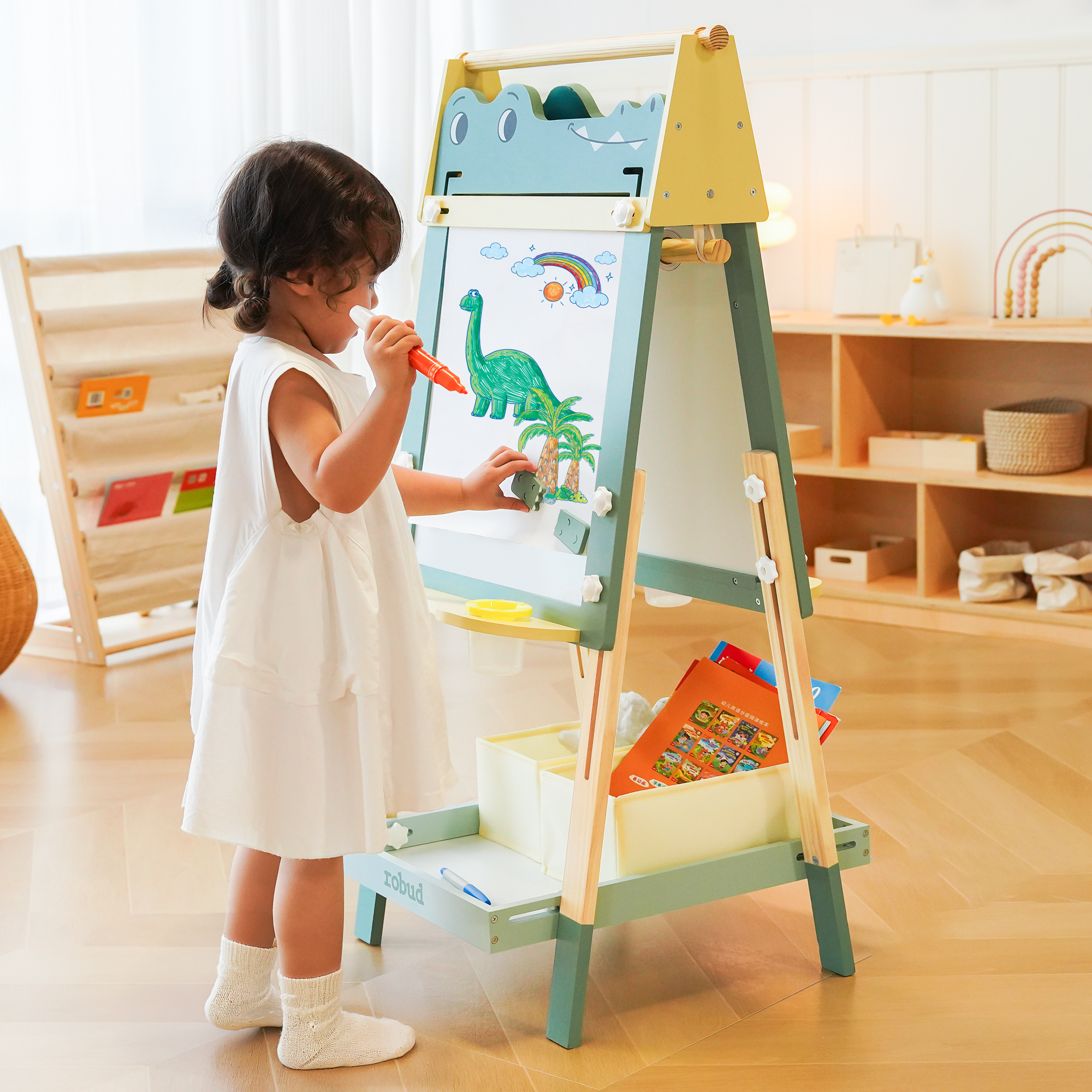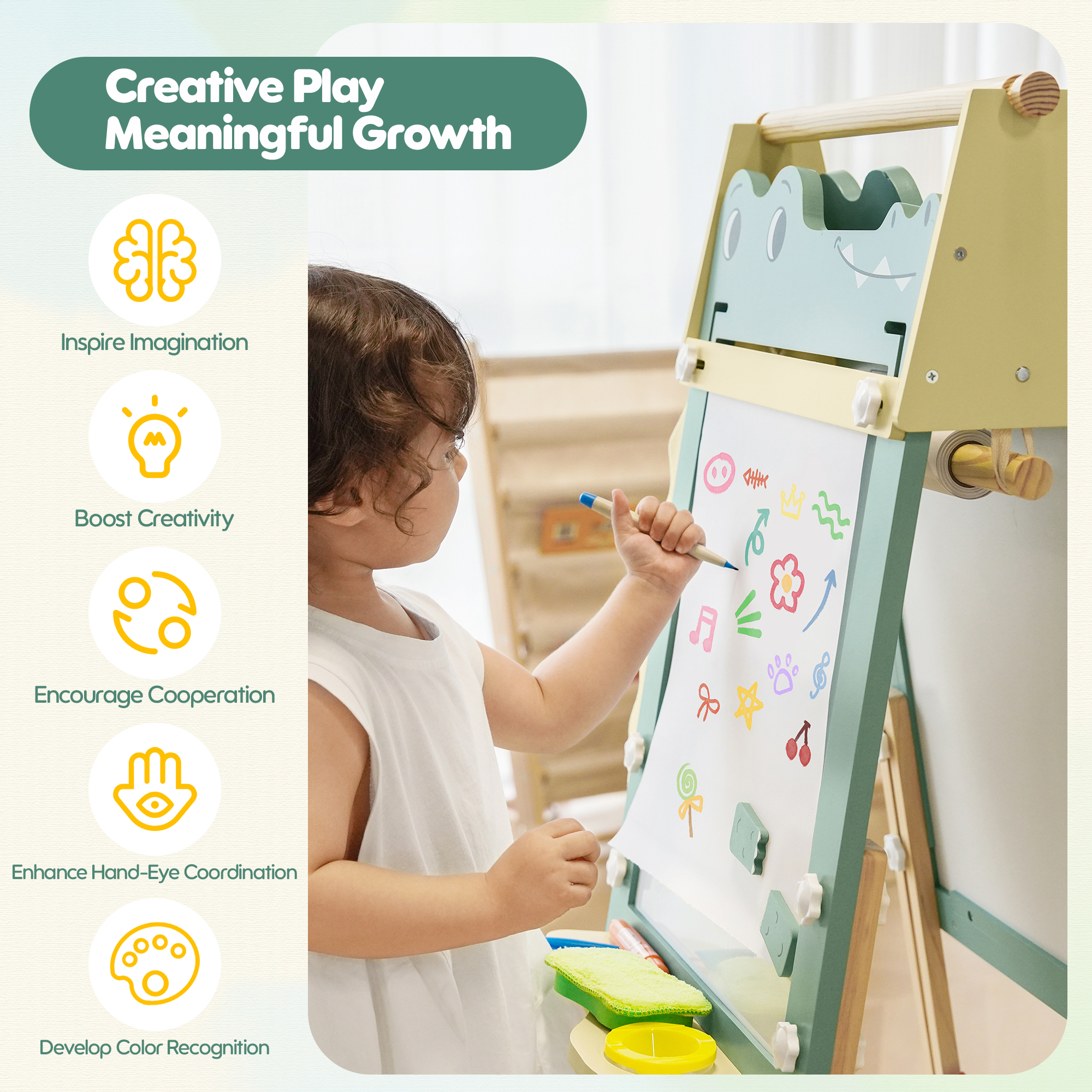- 【Divertimento nell'Apprendimento Montessori】Ispira ore di attività educative: disegno, colorazione, pratica delle lettere e giochi matematici. Il tema giocoso del coccodrillo stimola la creatività del cavalletto da pittura per bambini mentre sviluppa abilità di apprendimento precoce attraverso il gioco coinvolgente.