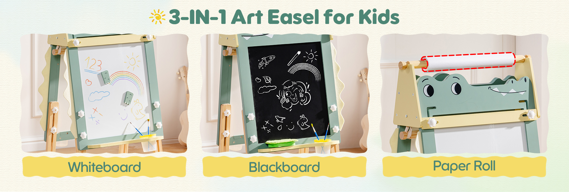 - 【Centro Artistico 3-in-1】Completo cavalletto artistico per bambini con lavagna magnetica, lavagna cancellabile e rotolo di carta. Include: 1 gomma, 2 tazze per la vernice, 2 clip a coccodrillo magnetiche e 2 contenitori di stoccaggio. Progettato per l'apprendimento artistico e il gioco educativo per bambini dai 3 anni in su.