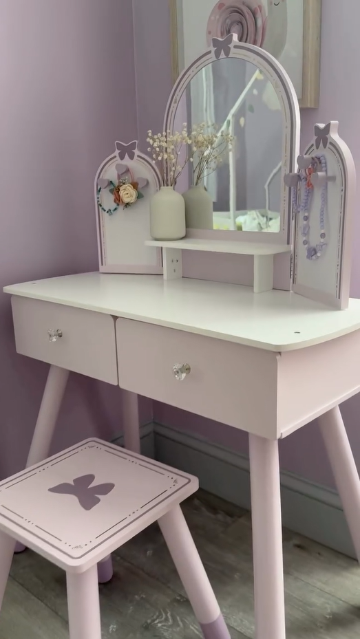 【Set di Tavolo da Trucco a Farfalla】Questo set di tavolo da trucco a farfalla è facile da assemblare, con cassetti e specchi piccoli rimovibili e una piccola panchina di legno per creare una versione mini realistica di un tavolo da trucco a grandezza naturale. I bambini possono divertirsi a giocarci.