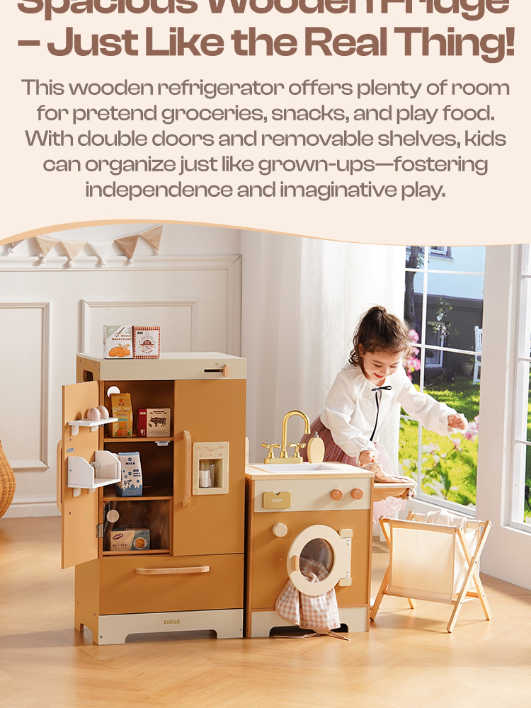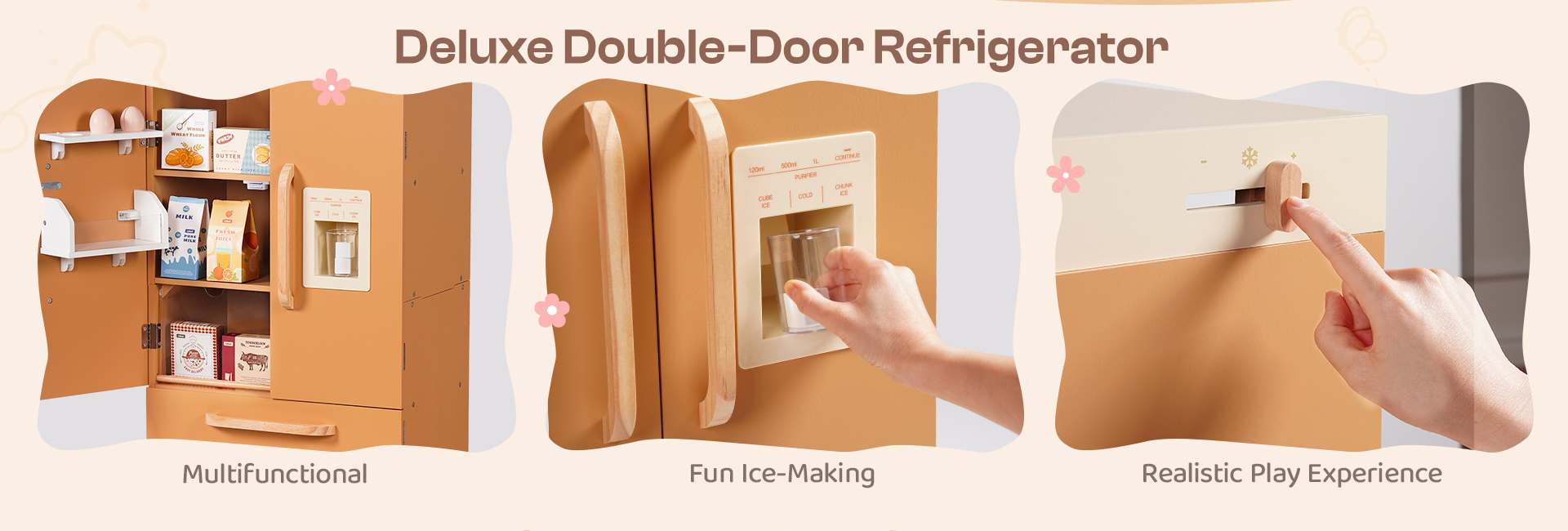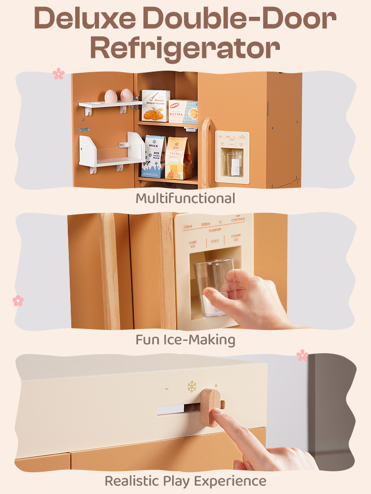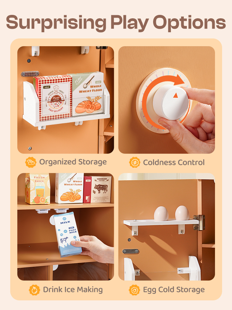 Manopola della Temperatura Regolabile: Il frigorifero include una divertente manopola della temperatura regolabile che consente ai bambini di fingere di controllare la temperatura del frigorifero, migliorando la loro esperienza di gioco di ruolo e la comprensione degli elettrodomestici del mondo reale.