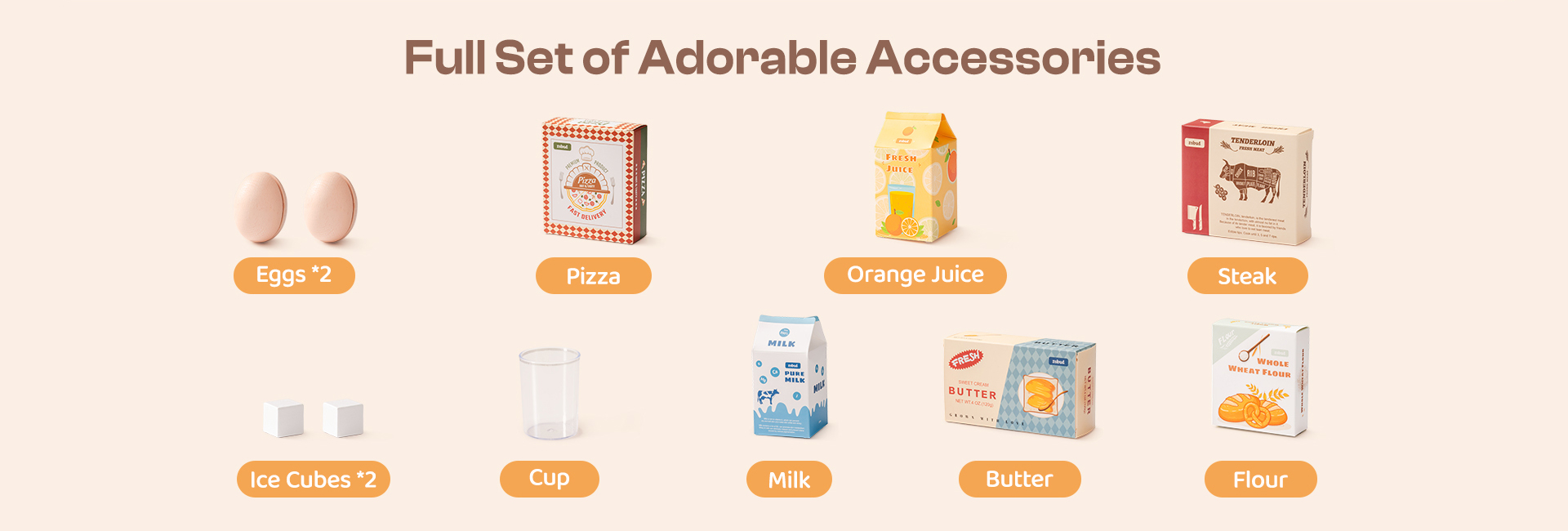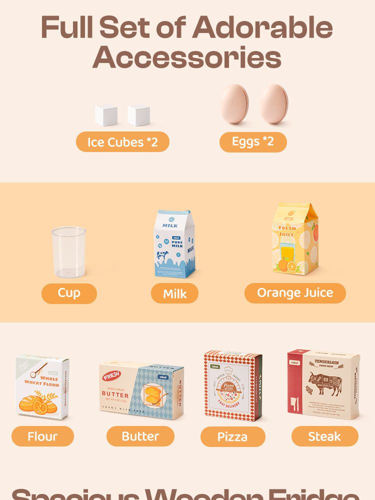 Esperienza di Gioco Realistica: Questo frigorifero da cucina in legno viene fornito con alimenti realistici, tra cui gelato, uova e altre prelibatezze. L'uovo "da tagliare" incluso offre un'esperienza interattiva, permettendo ai bambini di tagliare l'uovo a metà per un divertimento aggiuntivo.