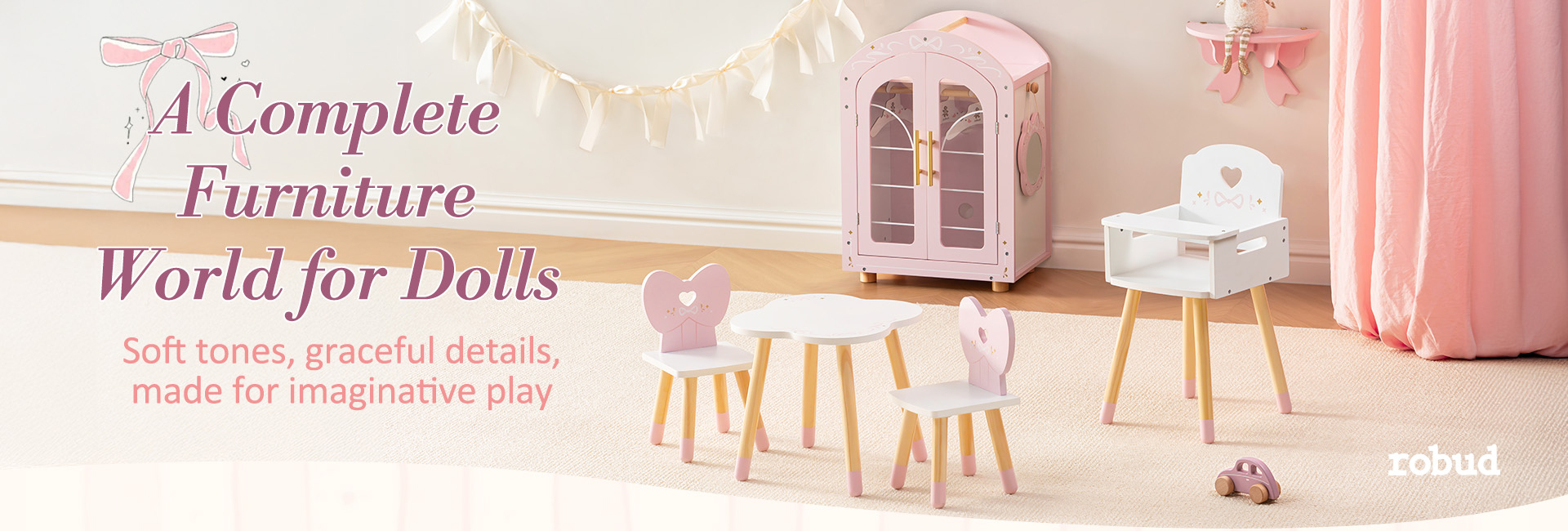 🏠 Costruisci una Casa Accogliente Completa per Bambole: Come parte della serie di mobili per bambole ROBUD, questo mobile per bambole in legno si abbina e si mescola con il letto per bambole, il divano e il set da pranzo. Crea una casa accogliente e coordinata per le tue bambole di 18 pollici e lascia fiorire le avventure narrative di tuo figlio.