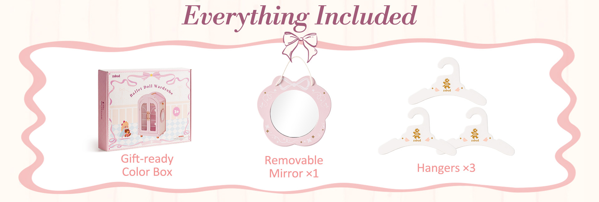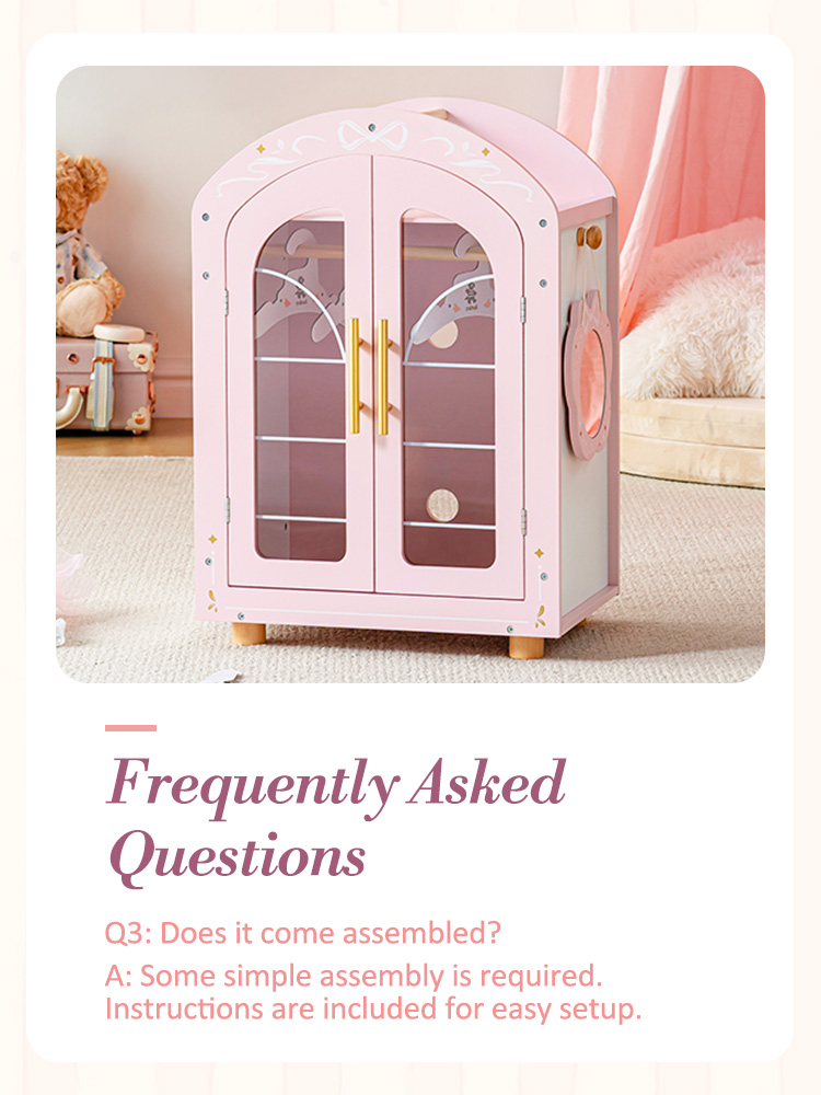 💗 Divertimento con il Costume e Specchio Mobile: Questo armadio per bambole è pieno di caratteristiche giocose! Lo specchio laterale rimovibile consente alle bambole di "controllare il loro look" prima di andare a immaginarie feste del tè. La mensola superiore è perfetta per riporre scarpe e borse piccole e altri accessori per bambole, e le maniglie facili da afferrare rendono semplice per le mani piccole aprire e chiudere.