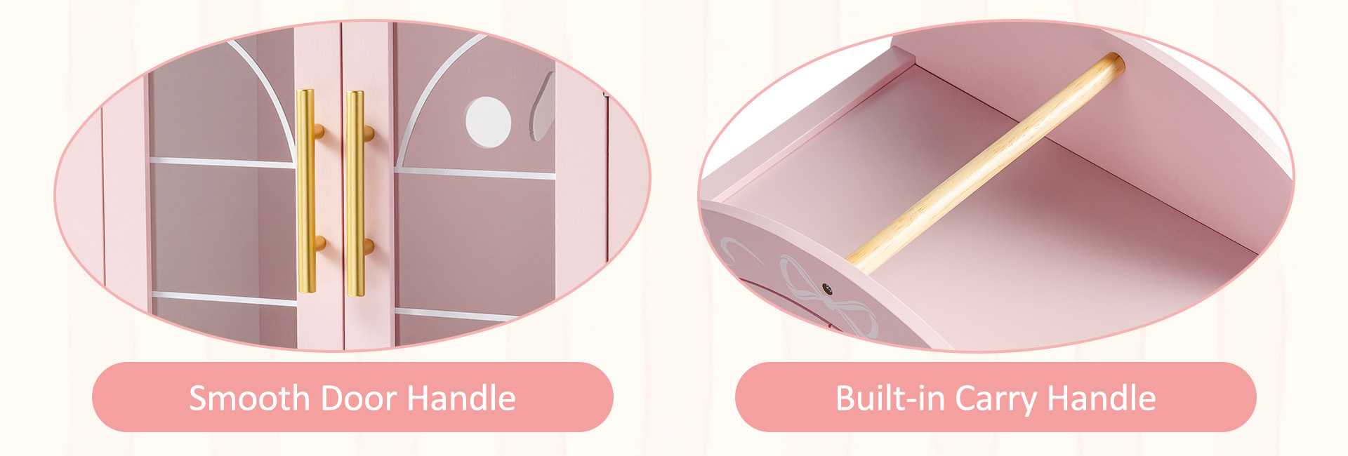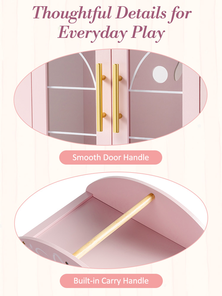 🌿 Sicuro, Robusto e Pronto a Muoversi: Realizzato in legno liscio e senza schegge con gambe stabili e porte sicure, questo organizzatore di stoccaggio per bambole è progettato per gestire il gioco entusiasta. Le gambe in legno stabili e le doppie porte sicure garantiscono che rimanga robusto attraverso innumerevoli cambi d'outfit e sessioni di gioco. La maniglia superiore consente a tuo figlio di portare l'armadio ovunque—dalla stanza da gioco a casa di un amico—mantenendo il tempo di gioco attivo.