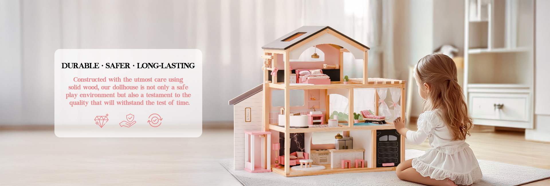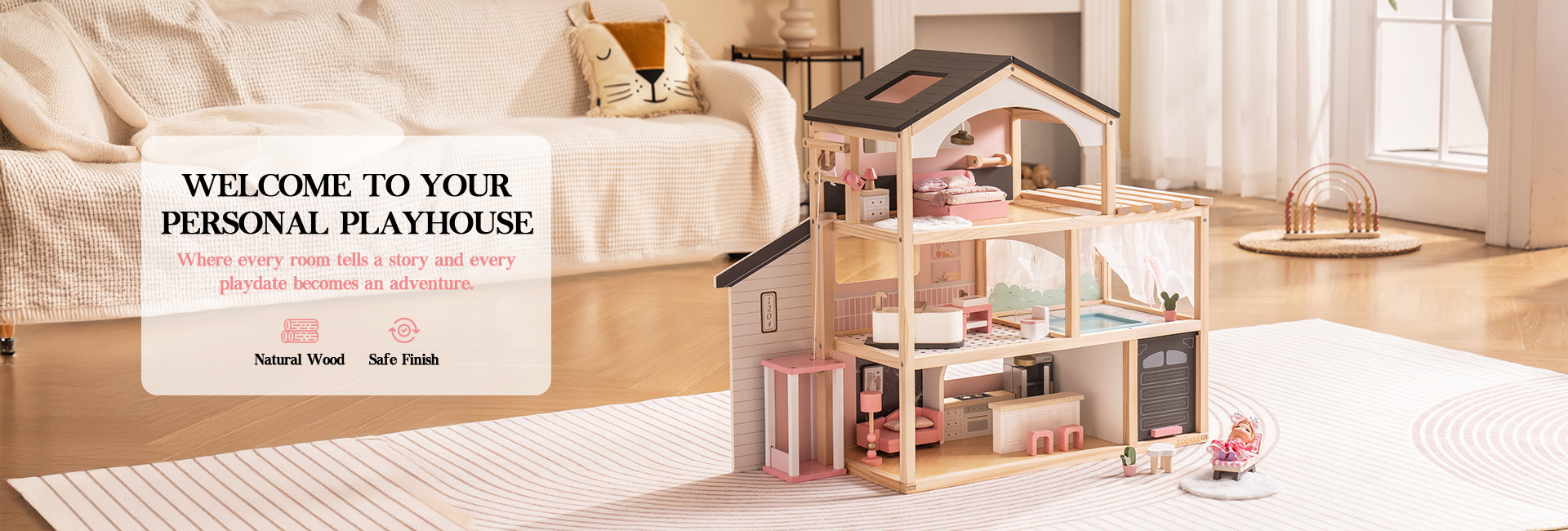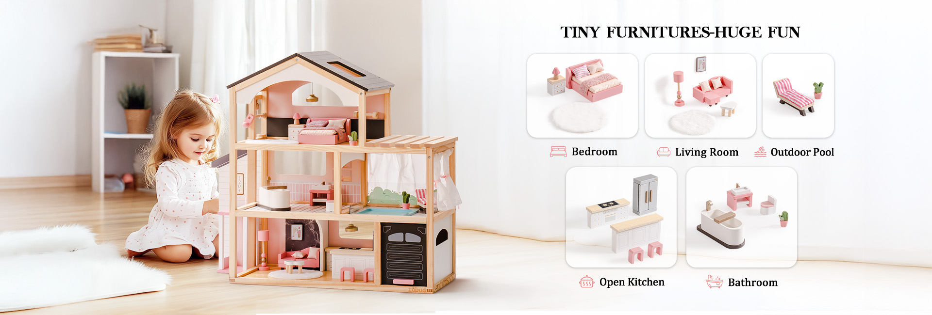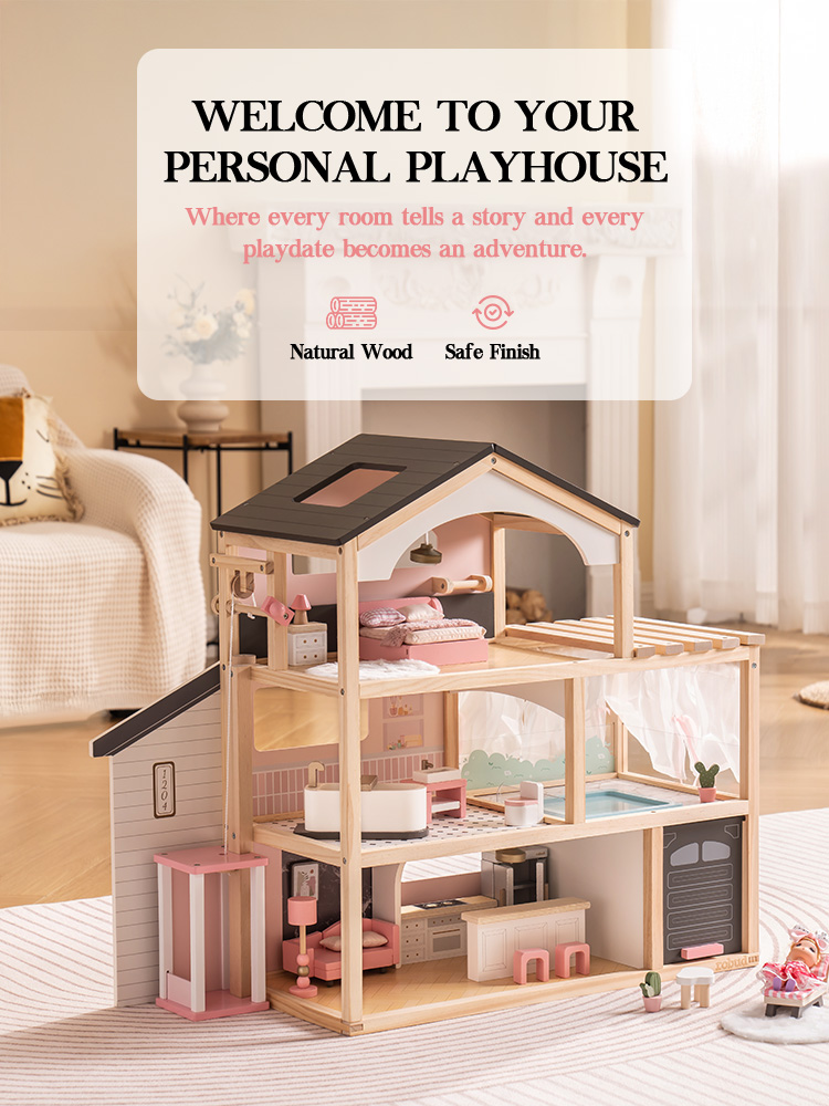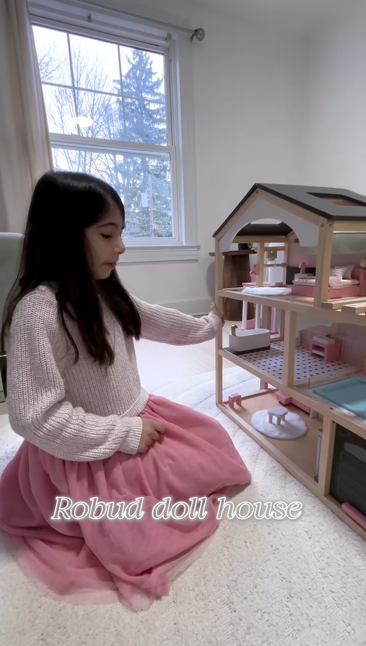 Elegante casa da sogno: La casa delle bambole ROBUD presenta un elegante tetto nero e una struttura in legno naturale, mescolando elementi architettonici moderni con dettagli realistici per mostrare il fascino degli spazi abitativi contemporanei, dedicata a fornire ai bambini un'esperienza di gioco fantasiosa.
